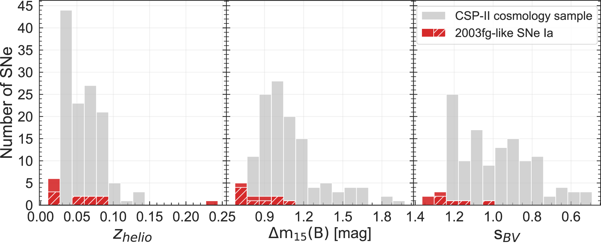Figure 1. Histograms of zhelio (left panel), Δm15(B) (middle panel), and sBV (right panel) of the 2003fg-like SN sample compared to the CSP-II SN Ia cosmology sample from Phillips et al. (2019). Nine 2003fg-like SNe followed up by CSP (including CSP-I and CSP-II) are marked with red hatched bars, and four not followed up by CSP are stacked on top with red non-hatched bars. The SNe Ia from Phillips et al. (2019) are shown as gray shaded bars.
