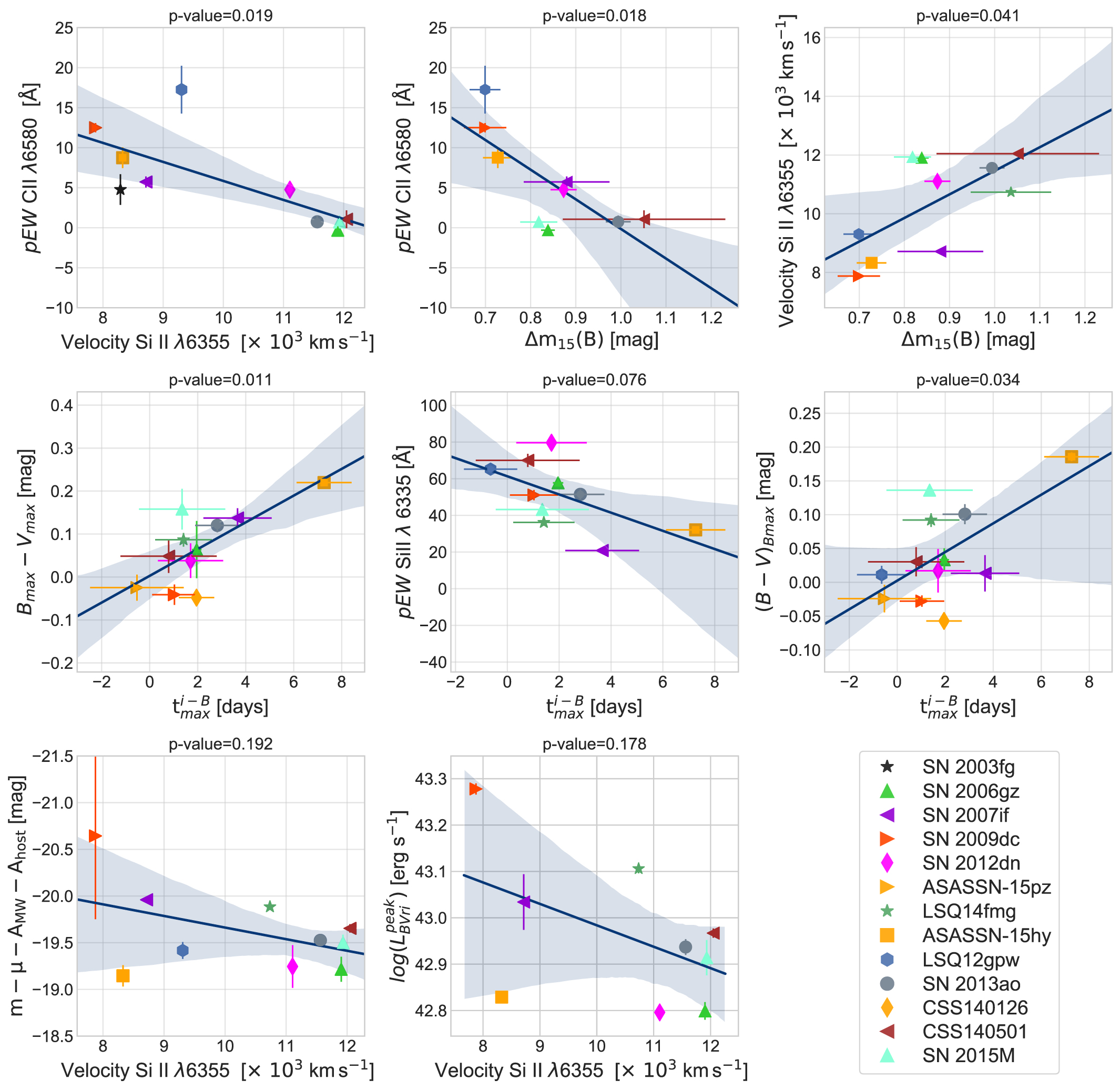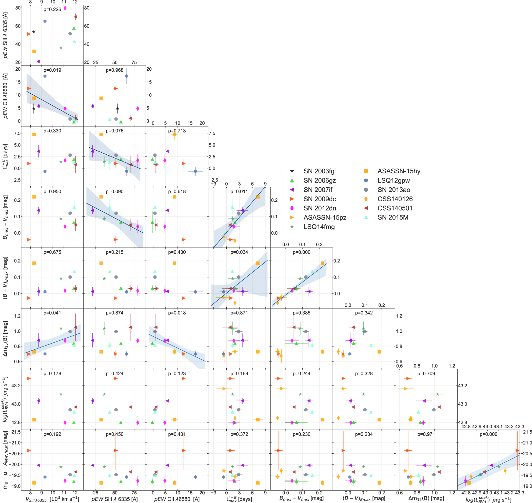 Figure B1. A pair plot of measured parameters of 2003fg-like SNe; on top of each panel the p-value is given. Potentially significant correlations with p ≤ 0.1 are presented by the best-fit line determined by a least-squares technique along with the 95% confidence intervals in each panel.