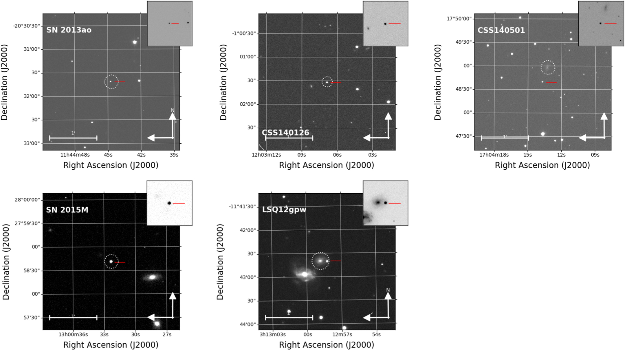 Figure 2. The r-band finding charts of the five 2003fg-like SNe observed by CSP-II. The plots were produced with Swope e2v images. An inset of the exact SN location is provided in the top right section of each panel.