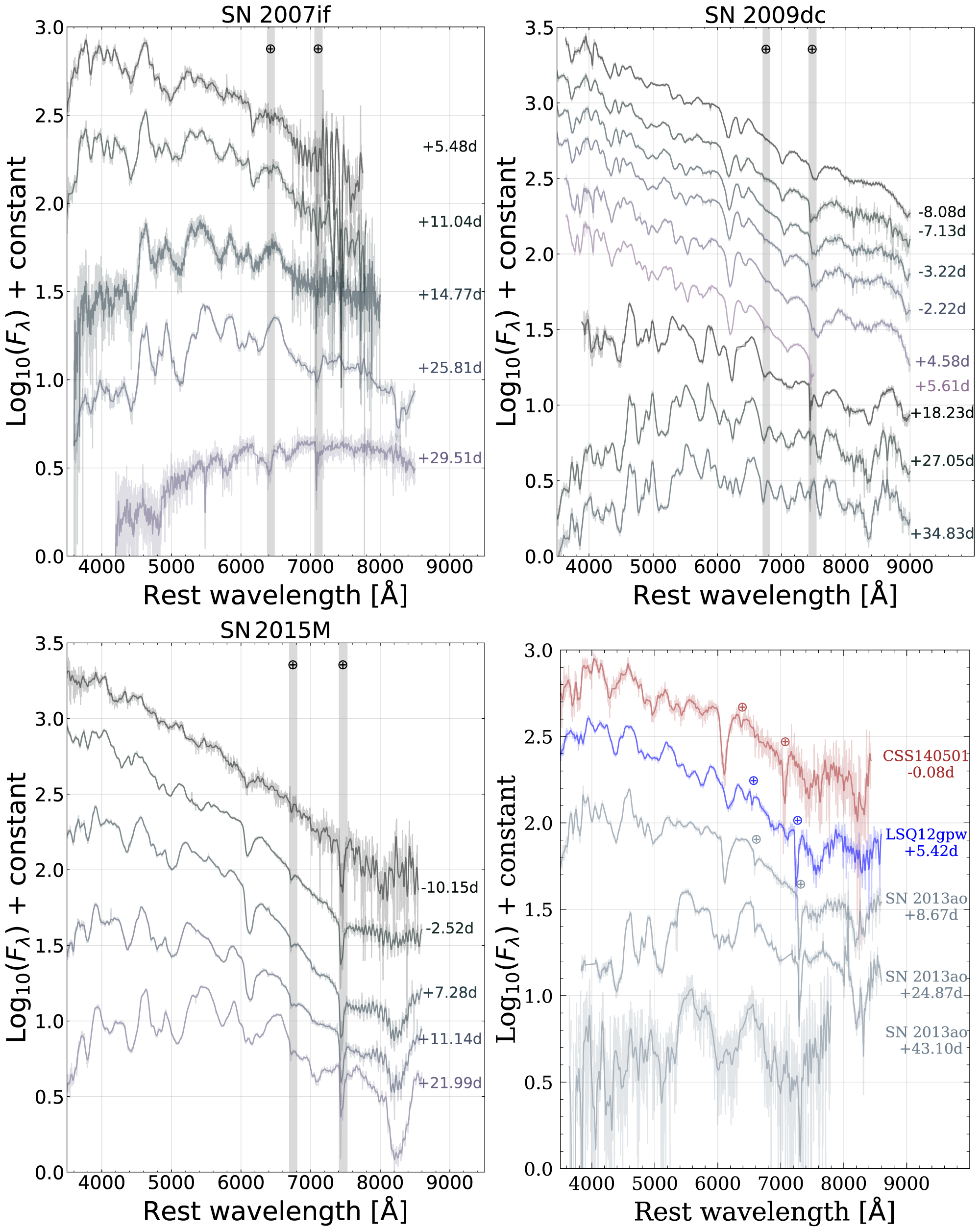 Plots of the previously unpublished CSP spectra of SN 2007if, SN 2009dc, LSQ 12gpw, SN 2013ao, CSS 140126, CSS 140501, and SN 2015M are presented in Figures 4 and 5. All of the spectra for analysis have been made available at the CSP website. 32