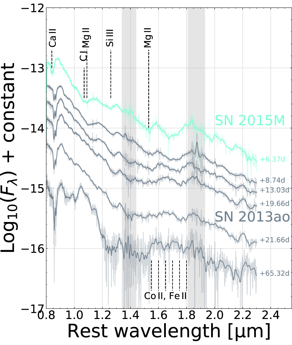 Standard image High-resolution imageFigure 5. Rest-frame NIR spectra of all unpublished 2003fg-like SNe from CSP. Rest-frame phases relative to the B-band maximum are given next to each spectrum. Note that C i is only seen in the spectra of SN 2015M and not in those of SN 2013ao. These data have not been corrected for extinction.