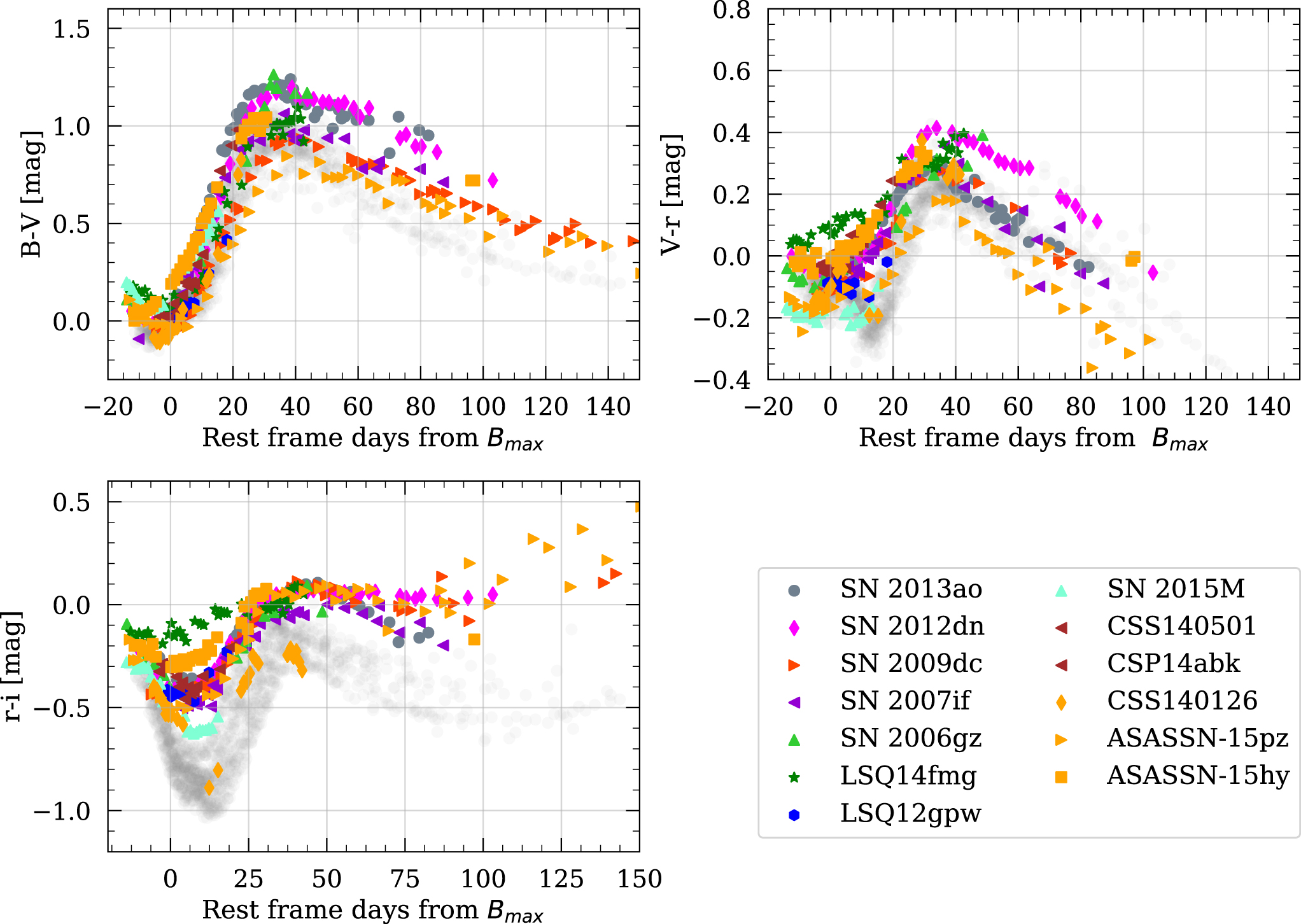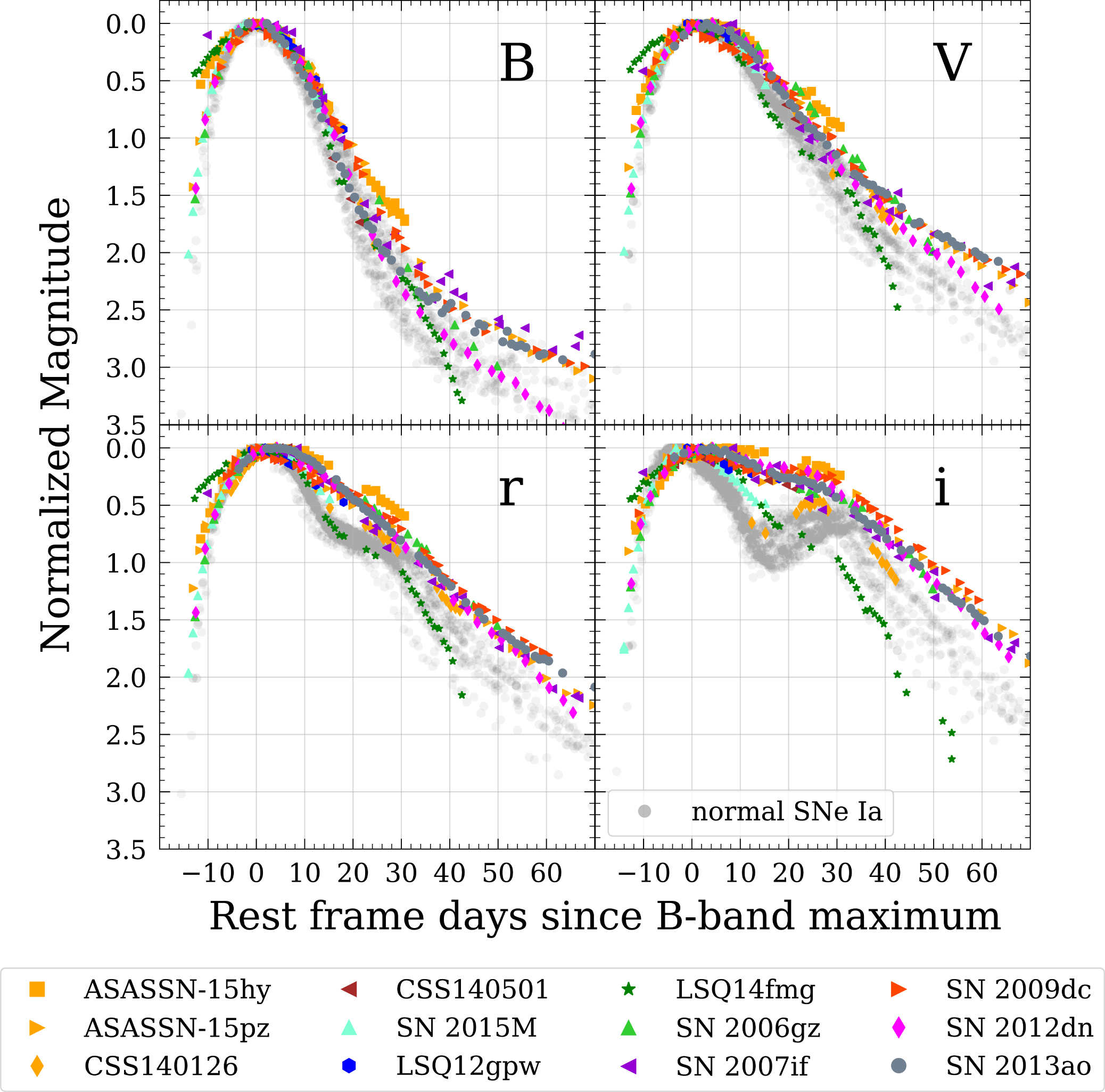 We note that CSS 140126 has a secondary i-band maximum but has an uncertain classification due to low-S/N spectra. However it fits into our sample because it peaks in the i band after peaking in the B band.