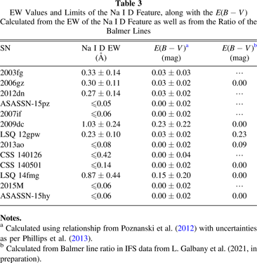 Two methods were adopted to estimate the host extinction for the 2003fg-like SNe: (i) measurement of the equivalent width (EW) of the host galaxy Na i D feature and (ii) measurement of the Balmer decrements of the host galaxy lines at the SN location using IFS data from L. Galbany et al. (2021, in preparation). Both of these techniques suffer from shortcomings, which we discuss below. It is established that if an SN has an Na i D feature it may have some host galaxy extinction, and in the Milky Way there is a well-known correlation between the Av and the EW of Na i D (e.g., see Poznanski et al. 2012 and references therein). However, the scatter in this correlation is ±68% and a significant fraction of SNe Ia display anomalously large Na i D EWs in comparison with the Av values derived from their colors (Phillips et al. 2013). Furthermore, most of the spectra we analyze in this work are of low resolution, making it difficult to detect a weak Na i D feature.
