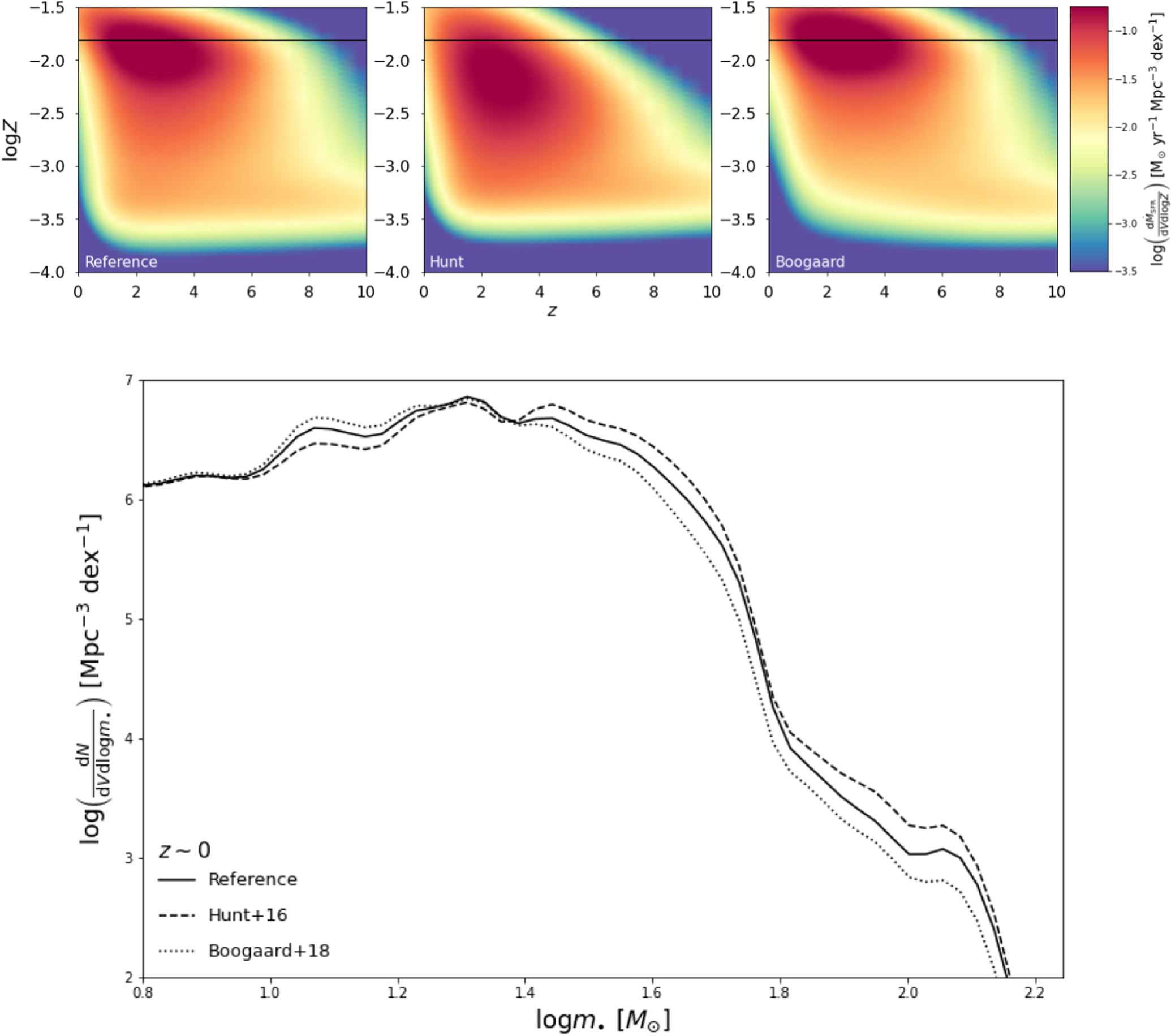 As to the galactic term, the main source of uncertainty is constituted by the adopted main sequence and fundamental metallicity relationships. To estimate the related degree of uncertainty, we recomputed the galactic term by using in turn the main-sequence relation by Boogaard et al. (2018) in place of our reference by Speagle et al. (2014), and the fundamental metallicity relation by Hunt et al. (2016) in place of our reference by Mannucci et al. (2011). The results are illustrated in Figure 10, and it is seen that the related changes on the stellar BH relic mass function are minor.