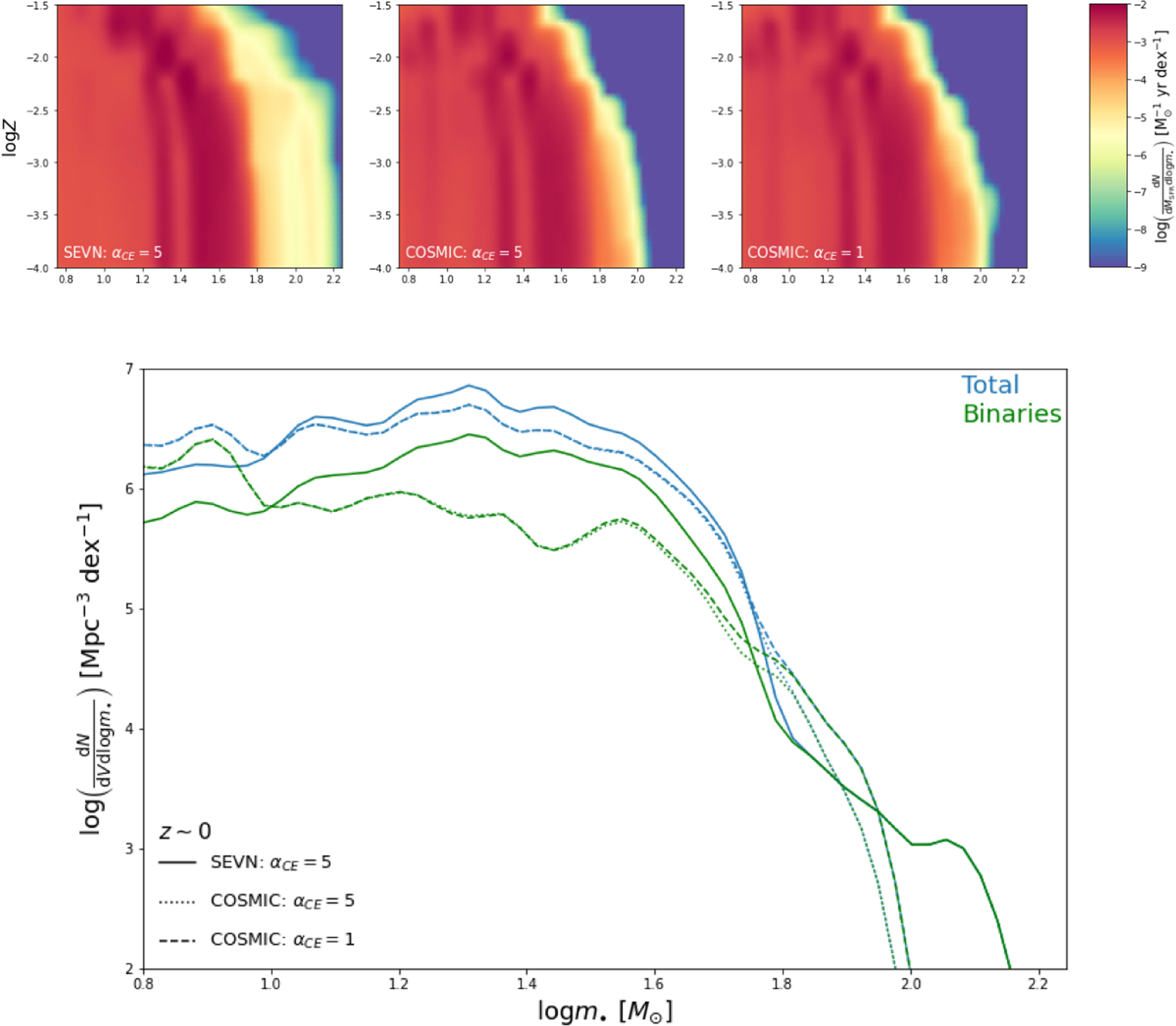 Standard image High-resolution imageAmong the many parameters entering binary evolution codes, a major role is played by the common-envelope parameter αCE, that quantifies the energy available to unbind the envelope (see Ivanova et al. 2013). As in Spera et al. (2019), we have set αCE = 5 throughout this paper and in the above comparison between SEVN and COSMIC. To have a grasp on the impact of such a choice, we have also run COSMIC with αCE = 1, and show in Figure 11 the resulting stellar term (top right panel) and BH mass function at z = 0 (bottom panel, dashed lines). The impact of αCE is rather limited, and mainly affects the high-mass tail of the distribution, which is dominated by binary stellar evolution.