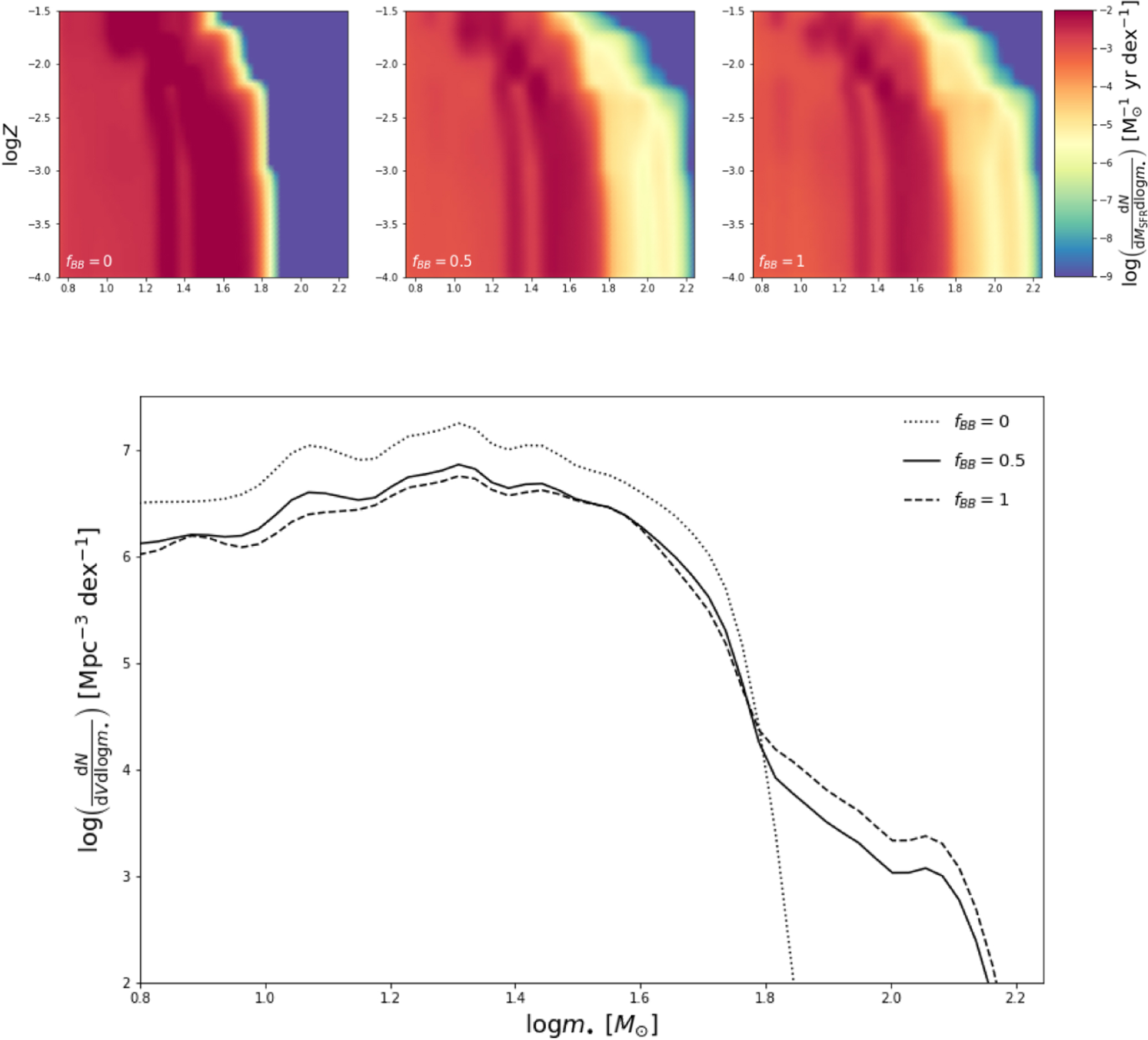 Figure 12. Impact of the binary fraction f⋆⋆ on our results (see Section 4.1). Top panels: the (total) stellar term of Equation (7) for f⋆⋆ = 0 (left; no stars born in binaries), 0.5 (middle; our fiducial case), and 1 (right; all stars born in binaries). Bottom panel: the relic stellar BH mass function at redshift z ∼ 0 for f⋆⋆ = 0 (dotted line), 0.5 (solid), and 1 (dashed).