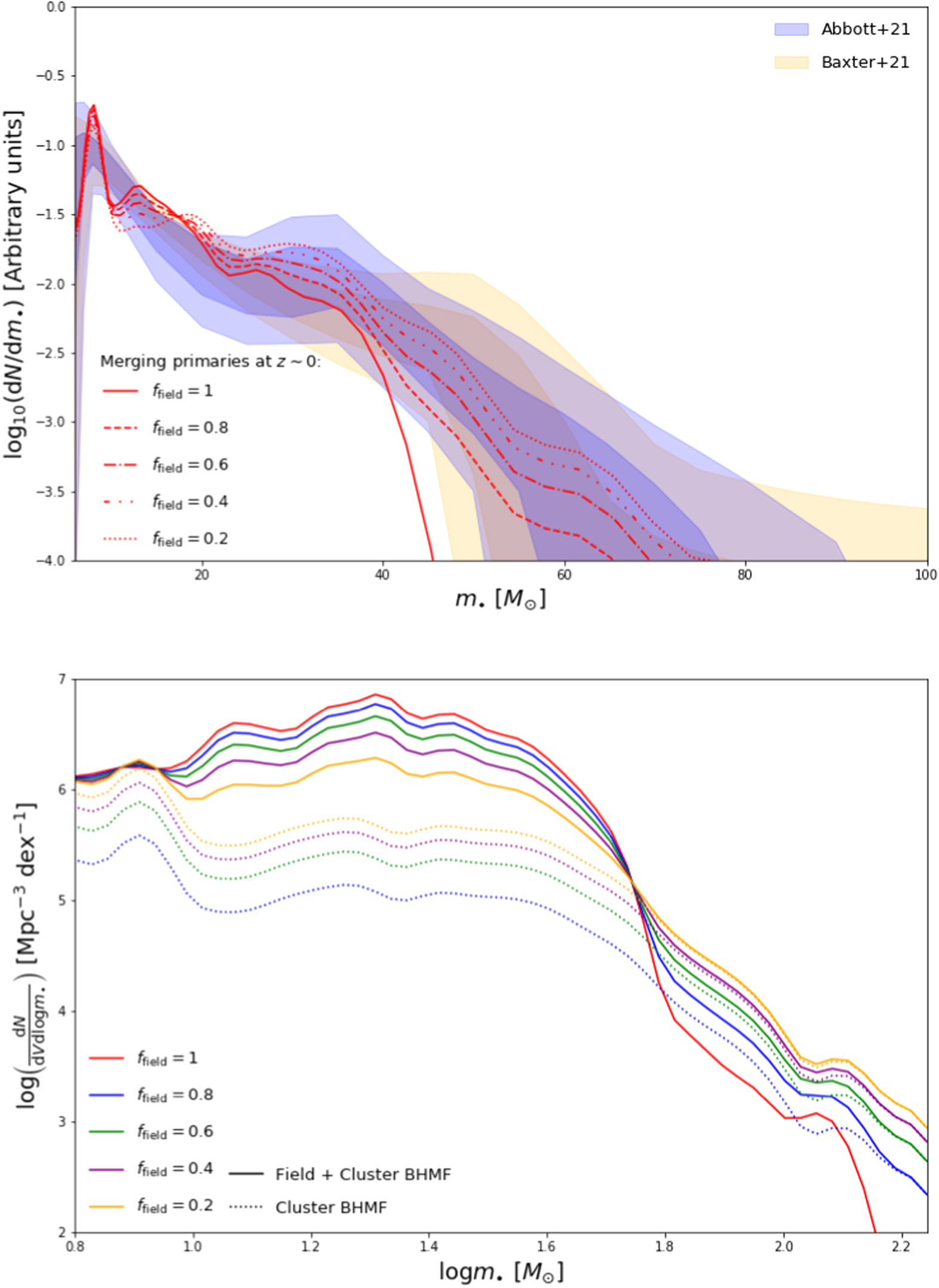 Standard image High-resolution imageTwo caveats are in order here. First, in the simulations by Di Carlo et al. (2019, 2020) the treatment of stellar mergers is based on simplified assumptions: no mass loss and chemical mixing during the merger, instantaneous recovery of hydrostatic equilibrium after the merger, and rejuvenation of the merger product according to the simple Hurley et al. (2002) prescriptions. Plainly, these details of the process are quite uncertain, and dedicated hydrodynamical simulations are required to have a better understanding of the final outcome. Second, in estimating the impact of the dynamical formation channel, we have considered only young star clusters for the sake of simplicity (and because the prompt availability of in-house dynamical simulations, which are extremely time demanding to run from scratch). Globular clusters and nuclear star clusters could also be effective environments to build up massive binary BHs, since hierarchical mergers are more efficient in very rich and compact stellar systems (e.g., Miller & Hamilton 2002; Antonini et al. 2019; Mapelli et al. 2021). Hence, including models for globular and nuclear star clusters could allow to reproduce the observed primary BH mass function with an even larger value of ffield.