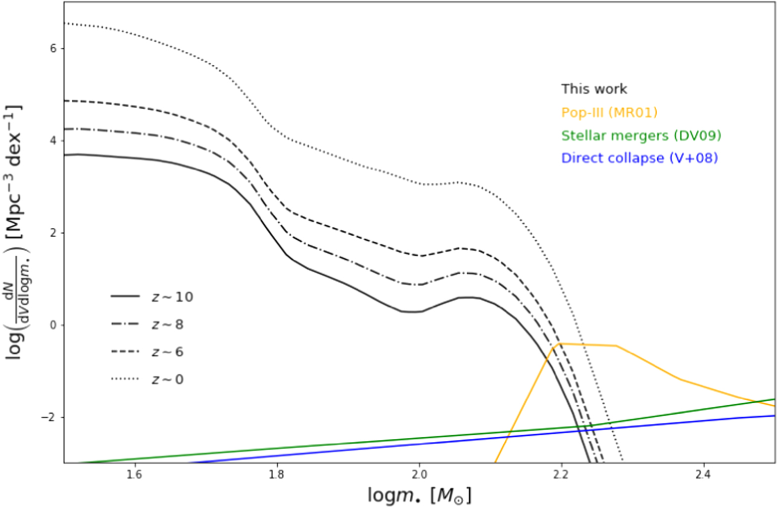 The light seed distributions from these models (extracted from Figure 4 of Volonteri 2010) are compared in Figure 14 with the mass function at z ∼ 6–10 from stellar BHs presented in this work. Given the appreciable contribution of the latter for masses m• ≲ 150 M⊙ at redshift z ≲ 10, it will be extremely relevant to include it in numerical simulations, semi-analytic and semiempirical models of BH formation and evolution at high redshift.