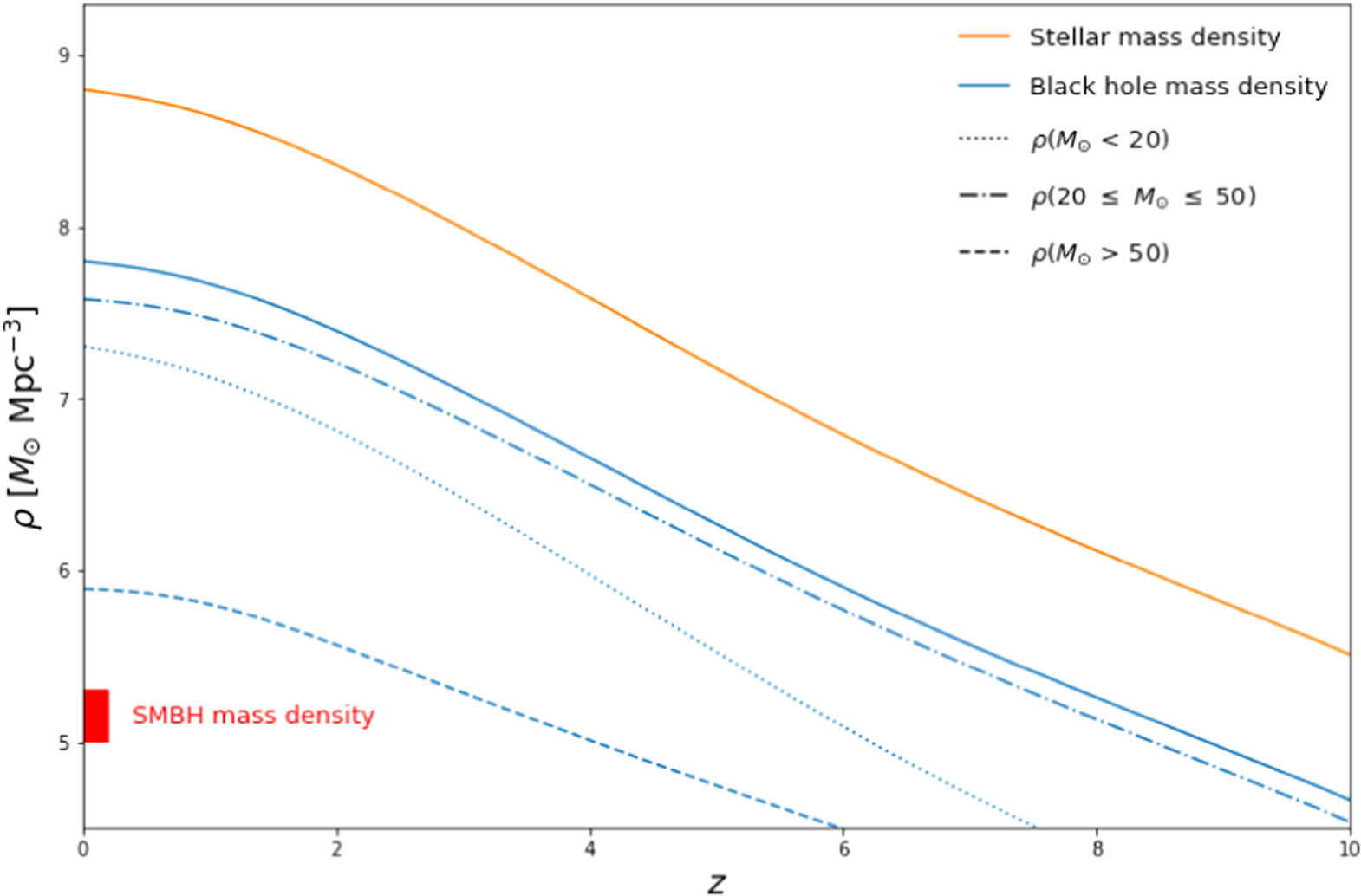 Figure 7. The relic density ρ• in stellar-mass BHs as a function of redshift z (solid blue line); contribution from different BH mass ranges are also displayed: m•/M⊙ ≲ 20 (dotted), 20 ≲ m•/M⊙ ≲ 50 (dashed) and m•/M⊙ ≳ 50 (dotted–dashed). For reference, the stellar-mass density in galaxies is also illustrated (orange line). Moreover, the observational estimate of the mass density in supermassive BHs with M• ∼ 106–1010 M⊙ at z ∼ 0 is shown (Shankar et al. 2020; red shaded area in the bottom left corner).
