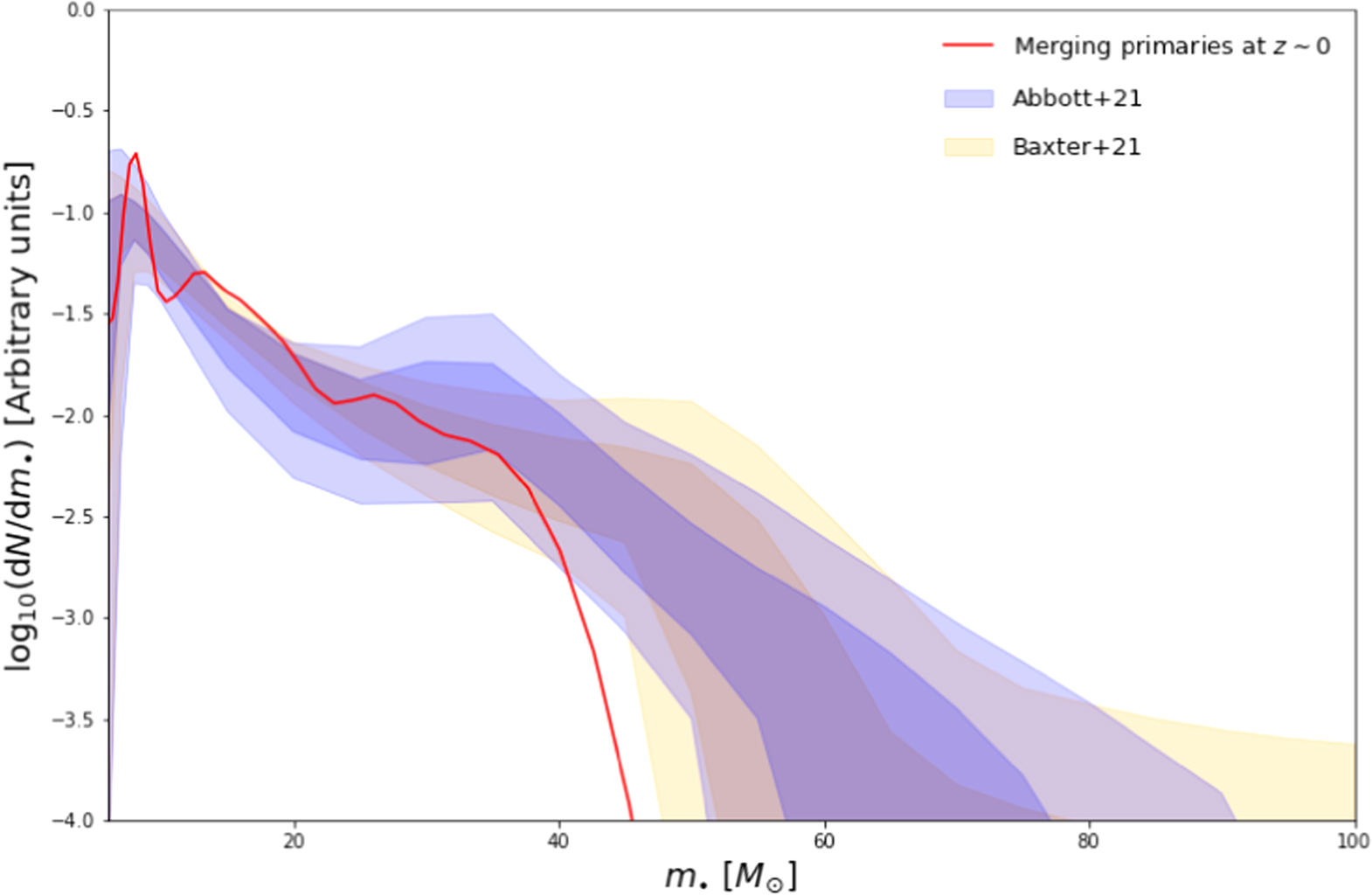 Figure 9. The BH mass function of merging BH binaries as a function of primary BH mass at z ≈ 0. The outcome of this work is illustrated by the red solid line. Estimates from the analysis of gravitational wave observations by Abbott et al. (2021a) and Baxter et al. (2021) are reported as blue and orange shaded areas, respectively (for both determinations the 68% and 95% credible intervals are represented with dark and light shades).