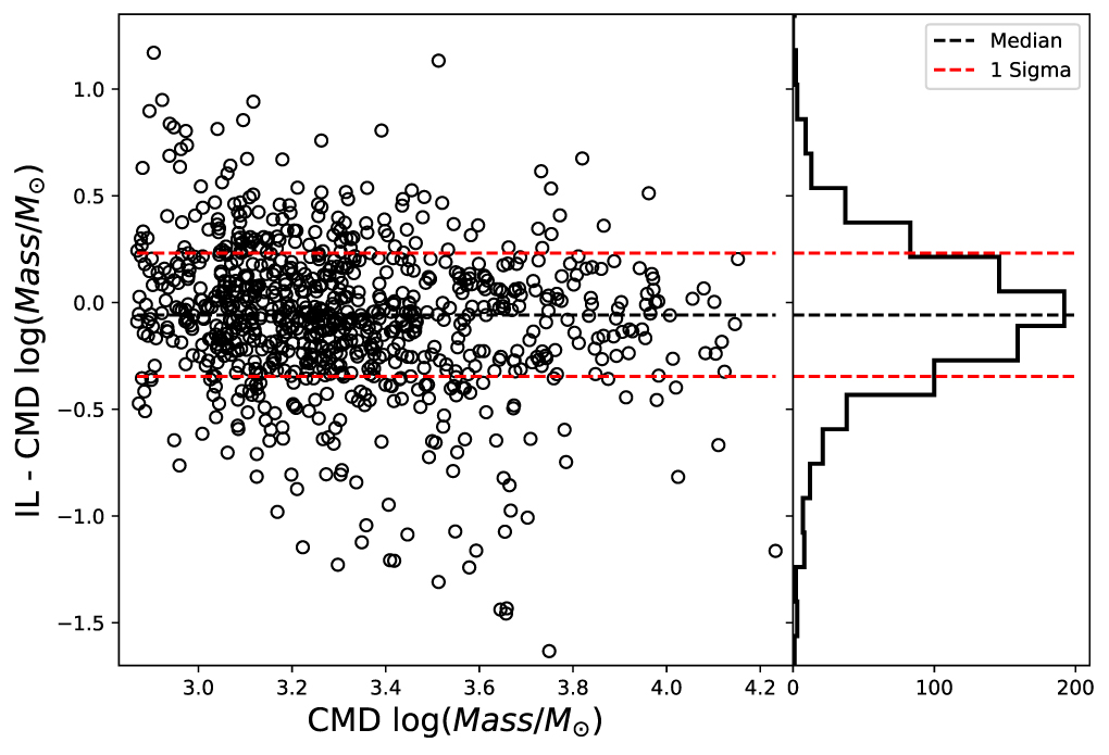 Figure 10. The comparison between M31 cluster masses derived from CMD analysis of Johnson et al. (2017) and integrated light (IL) analysis of M. Fouesneau (private communication). The y-axis shows the difference between the integrated light and CMD mass estimates, plotted against the CMD mass estimate. Clusters are represented by the open black circles, where the dashed black line represents the median of the distribution, and the red dashed lines represent the 1σ range. The additional panel shows the one-dimensional distribution of the differences.