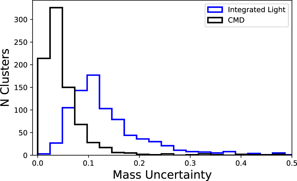 Standard image High-resolution imageWe quantify the distributions of reported uncertainties for the two methods in Figure 11. The median 1σ errors on the cluster masses from the CMD method are just 0.03 dex. However, for the integrated light measurements, the median 1σ errors are 0.14 dex. Further, the median ratio of integrated light uncertainty to CMD uncertainty is 3.3. While the difference in uncertainties between the two methods is large, in Figure 10, we do not see a significant bias in the one-to-one comparison of cluster masses, with the median difference of −0.06 dex. However, there is a fair amount of scatter around this median with a standard deviation of 0.59 dex.