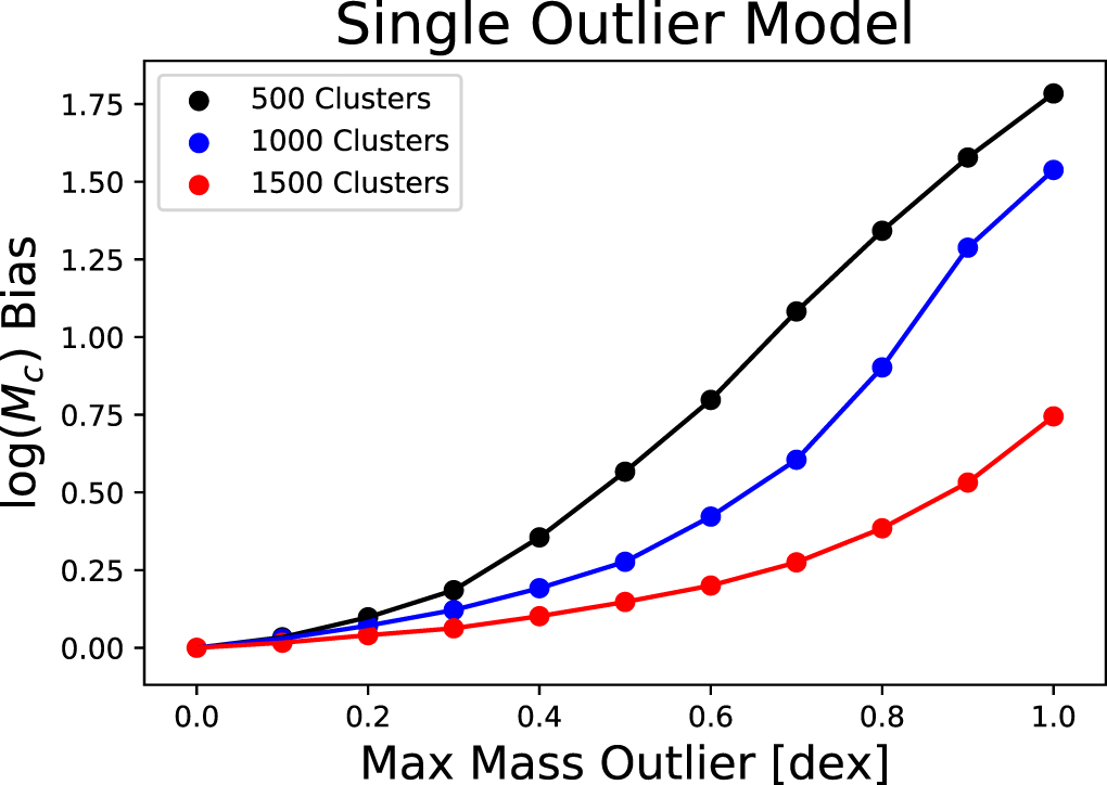 Standard image High-resolution imageFor each of the three samples presented in Figure 13, we calculate the delta BIC for Schechter parameters relative to the pure power-law model. Not surprisingly, we find that with increased number statistics, the delta BIC favoring a Schechter model is slightly larger. However, regardless of number statistics, the single outlier causes negligible changes to the delta BIC, and in all cases, the delta BIC is larger than 6, providing strong evidence for a Schechter function model over a power-law model according to the Kass & Raftery (1995) guidelines. While the Schechter function is still preferred, for large bias, the inferred Mc values are very poorly constrained with 1σ uncertainties upwards of ∼1 dex. These constraints are worse for the sample with the fewest clusters.