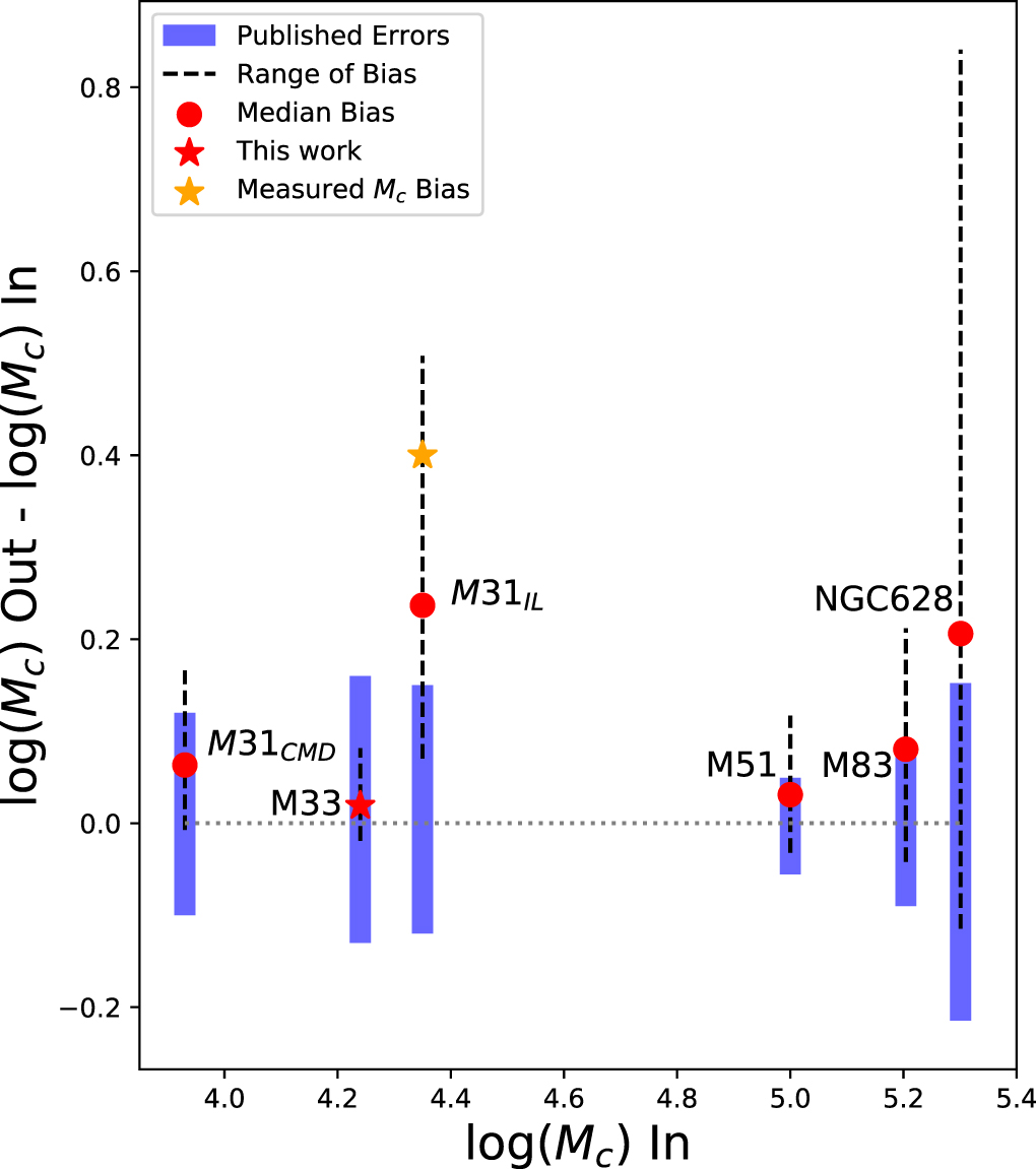 Figure 14. The bias in Schechter function truncation mass Mc for observed data sets. The y-axis indicates the difference in log(Mc ) values between simulations without (input) and with (output) mass errors. Red points indicate the median differences of 100 trials, while black dashed lines represent the 1σ range of results. The blue solid lines are the published confidence intervals centered around the dashed gray line at 0. We present experiment results for M33 (this work), M31 (CMD (Johnson et al. 2017); integrated light (M. Fouesneau, private communication), M51 (Messa et al. 2018), M83 (Adamo et al. 2015), and NGC628 (Adamo et al. 2017). The orange star represents the measured delta Mc between the CMD and integrated light measurements in M31; it shows that the observed difference falls within the distribution of the simulated differences.