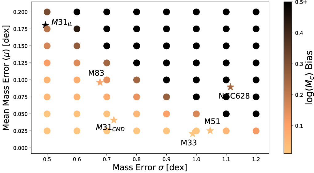 Figure 15. Bias in log(Mc ) estimates as a function of the distribution of individual cluster mass errors. The two axes represent the mean error and width of a log-normal distribution of errors. The grid of models show the resulting median Mc bias from 100 trials with mass errors included. The stars represent the error distributions for each of the galaxies in Figure 14, colored by the median bias found in Figure 14.