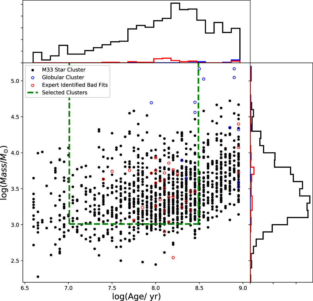 Figure 1. M33 cluster age and mass estimates for the Johnson et al. (2022) catalog. Black points represent clusters with good age and mass estimates. Objects unanimously identified by a group of coauthors to be globular clusters with true ages that are much older than the CMD fits are shown in blue, while other bad CMD fits are shown in red (see the text for details). The green dashed lines denote the sample selection for the 711 clusters we use for CMF fitting as discussed in Section 2.2. Additional panels show the one-dimensional distributions for mass and age.