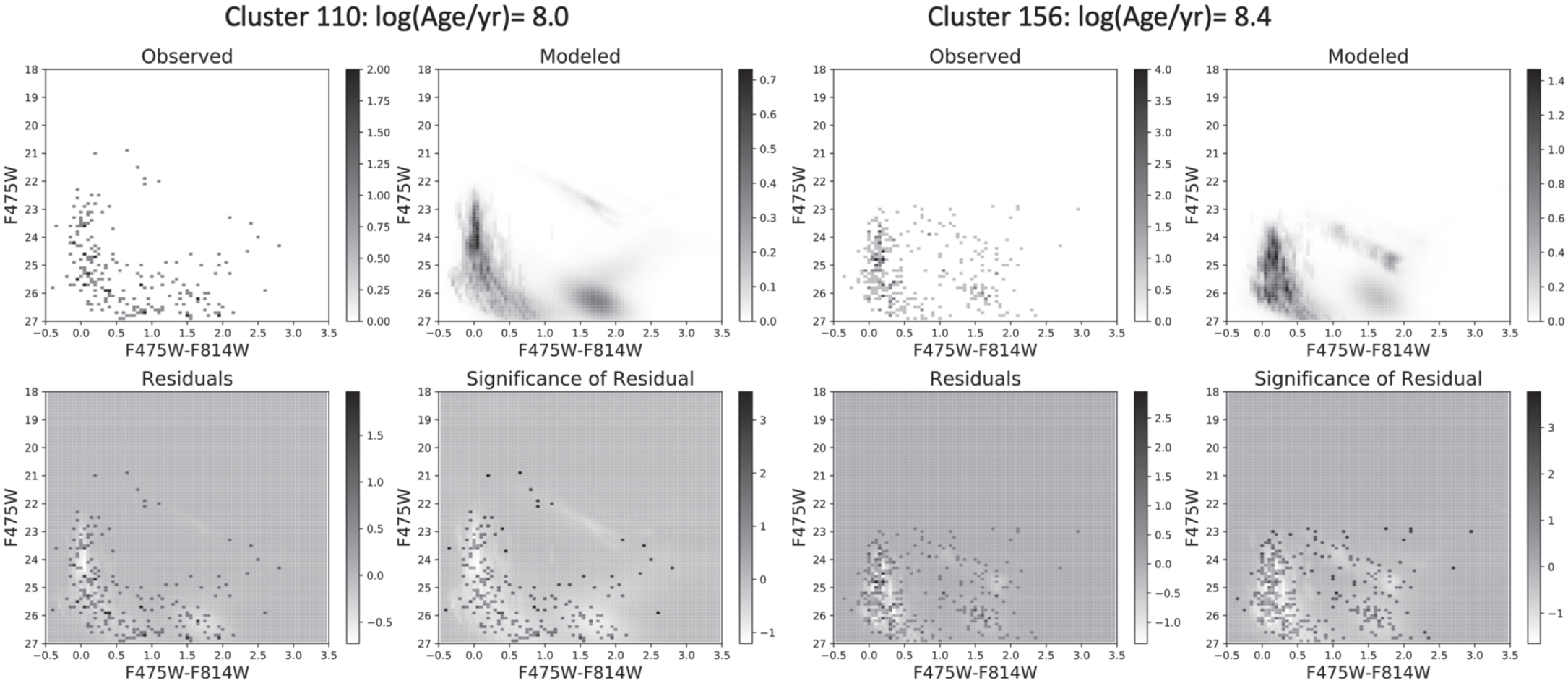 In Figure 2, we present CMD fitting results for two example clusters that lie at the median age (∼100 Myr; LGCS-M33 110) and maximum age (∼300 Myr; LGCS-M33 156) of the cluster sample. For each cluster, we show the observed CMD, modeled CMD, residuals, and the significance of the residuals.
