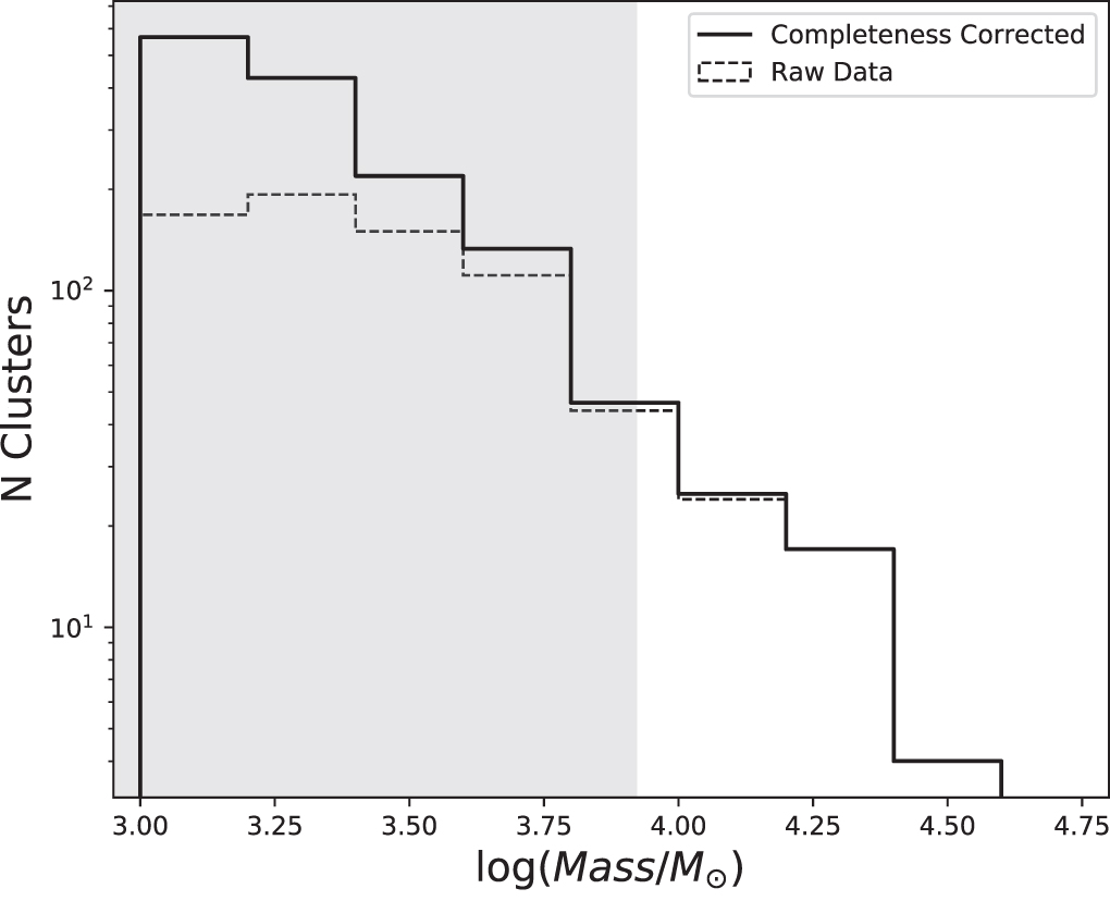 Figure 5. Observed and completeness-corrected mass distributions for our cluster sample. These mass distributions include clusters with mass above 103 M⊙ and age between 10 and 300 Myr. We present raw number counts in the dashed lines and the completeness-corrected distribution in the solid lines. The gray region represents the range of 50% completeness limits across our M33 sample.