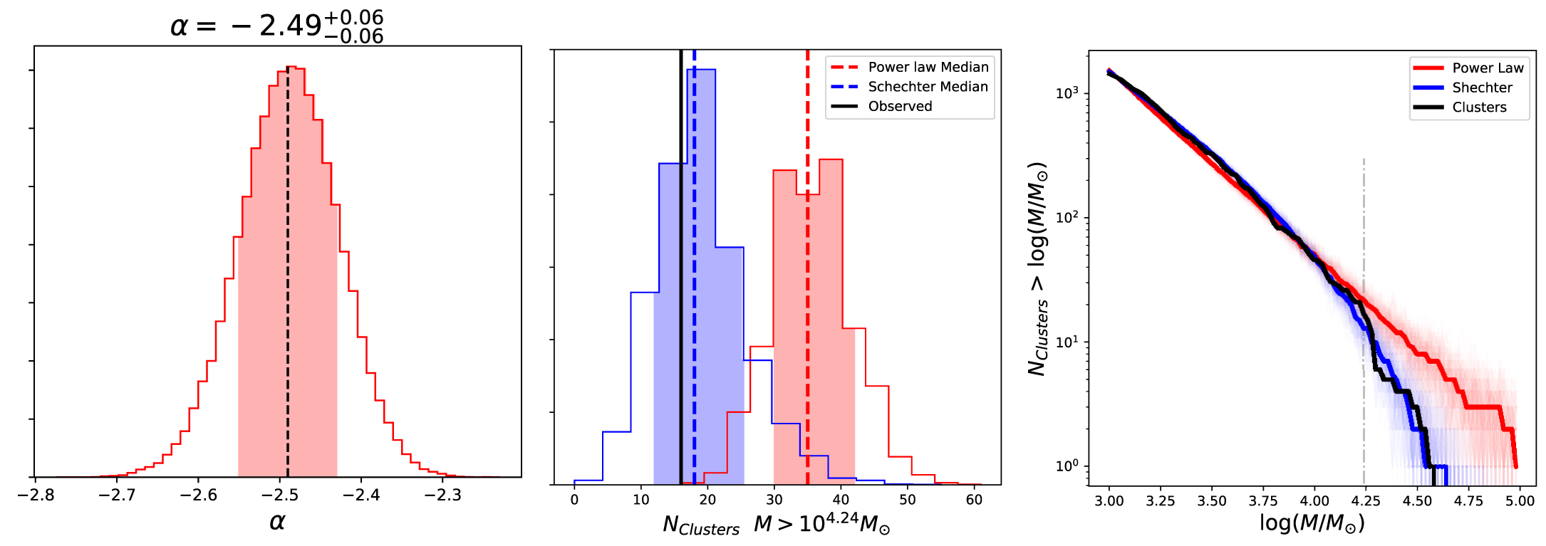 Figure 8. Pure power-law fit results and a comparison to Schechter function fits. Left: the marginalized PDF for power-law fitting results where the black line represents the median of the distribution, and the red shaded region shows the 1σ uncertainties. Middle: the number of clusters above the derived Mc value of 104.24 M⊙. The black vertical line shows the observed number of clusters above this mass. The Schechter (blue) and power-law (red) model distributions were determined by sampling 10,000 draws from each PDF and counting the total number of high-mass clusters above 104.24 M⊙. The dashed lines represent the median values, and the shaded regions are the 1σ uncertainties to the nearest whole cluster. Right: the cumulative number of clusters above the mass given on the x-axis. Black represents the observed counts in M33, which we compare to number counts from the Schechter function (blue) and power-law (red) models. For the models, we draw 100 random distributions with parameters of the median fitted PDF, and plot the median of the 100 samples in solid lines.
