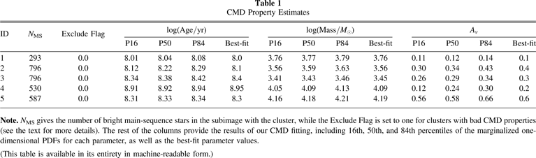 Note. NMS gives the number of bright main-sequence stars in the subimage with the cluster, while the Exclude Flag is set to one for clusters with bad CMD properties (see the text for more details). The rest of the columns provide the results of our CMD fitting, including 16th, 50th, and 84th percentiles of the marginalized one-dimensional PDFs for each parameter, as well as the best-fit parameter values.