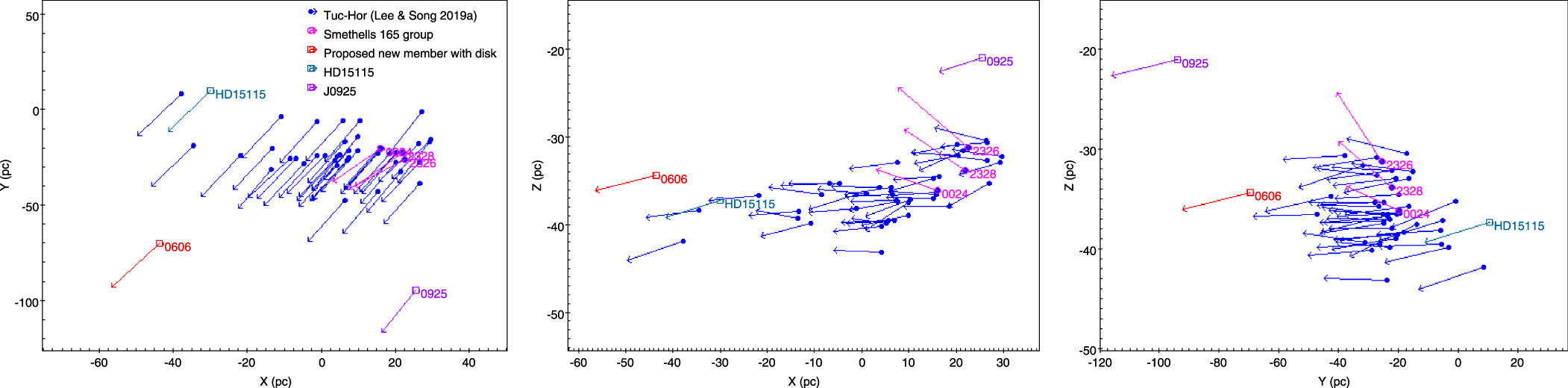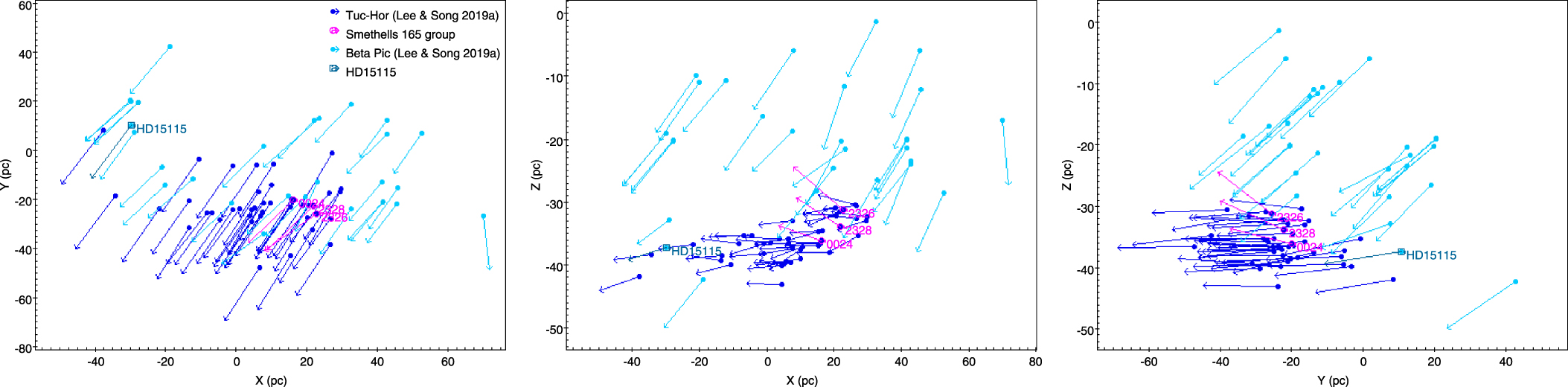 Figure 11. The well-known disk-hosting star HD 15115 (J022616.32+061732.8), shown as the dark teal square, was previously identified as a member of β Pictoris. However, its velocity and position are a better match for Tuc-Hor, as the middle and right panels of this figure reveal. Previously identified members of Tucana–Horologium (blue) and β Pictoris (turquoise) are from Lee & Song (2019a) in XYZ (parsecs from the Sun) with vectors showing UVW (parsecs per 1000 yr). The proposed Smethells 165 group is shown in magenta.