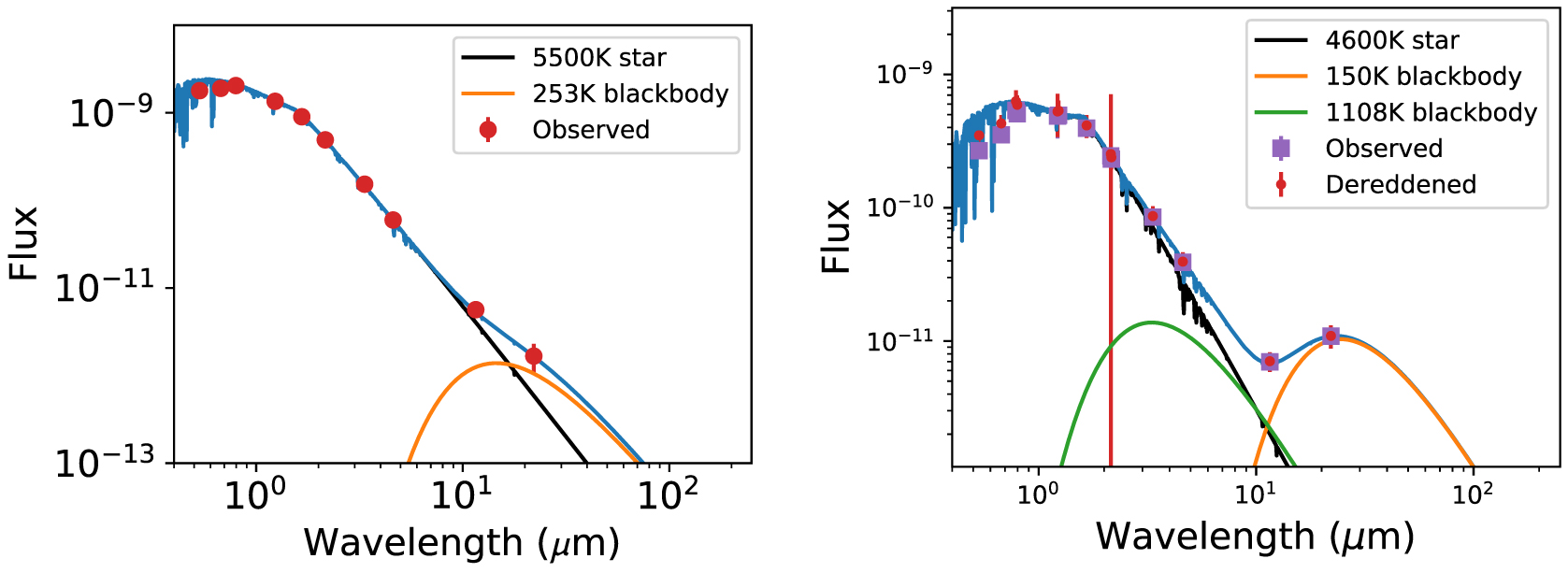 Figure 15. SEDs for J0441 (left) and J0925 (right). The photometry comes from Gaia DR2, 2MASS, WISE, and (for J0925) the Deep Near Infrared Survey of the Southern Sky (DENIS). Each star is fit by a BT-Settl/CIFIST stellar model (Baraffe et al. 2015), and the infrared excess is modeled by one or two blackbody functions. Data for J0925 are dereddened following the Fitzpatrick (1999) dereddening law as modified by Indebetouw et al. (2005). Note that the hot component of the excess emission from J0925 is variable, according to WISE photometry.