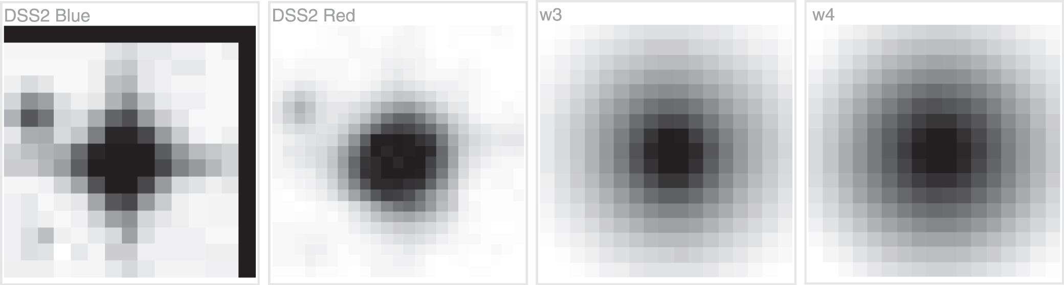 Figure 16. Images of J092521.90-673224.8 in DSS blue, DSS red, WISE 3, and WISE 4. Each postage stamp is 24'' × 24'' in angular extent. The background objects visible on the left of the DSS images do not seem to appear in the WISE images, implying that they do not explain the large excess emission measured in the W3 and W4 bands.