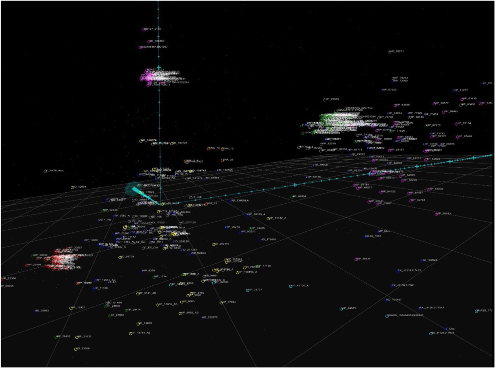 We then loaded the Gaia IDs of our catalog of 48,965 disk candidates from Disk Detective, including 13,626 that were determined by the neural network, as described above. We used these lists to highlight and color code the representations of the Gaia DR2 stars in our VR simulations. For example, in one run all the stars with disk candidates from Disk Detective were color coded orange, and all the known members of the Tuc-Hor association green, and turned off all the rest of the Gaia DR2 catalog. Figure 1 shows a representative screenshot of the PointCloudsVR simulation—collapsed to two dimensions of course. We used this color coding to highlight various lists of stars to search for new YSA members, one YSA at a time, using the following iterative process.
