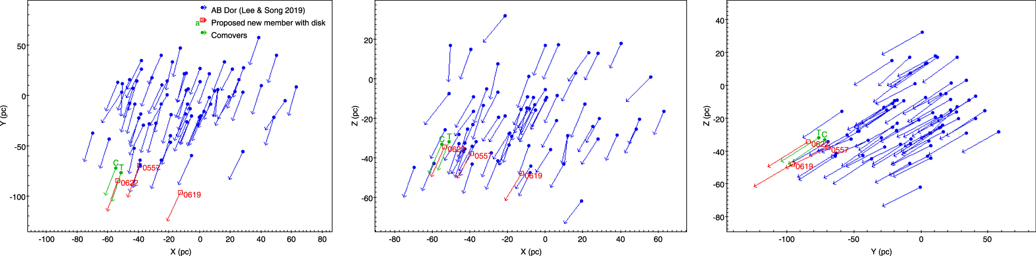 Figure 2. Previously identified members of AB Doradus from Lee & Song (2019a; blue), proposed new disk-hosting members of AB Doradus from Disk Detective (red) and co-moving stars (green), in XYZ (parsecs from the Sun) with vectors showing UVW (parsecs per 1000 yr). Of these candidates, J0622 is found in Table 5 of David & Hillenbrand (2015) as well as in co-moving catalogs Bochanski et al. (2018) and Oh et al. (2017) in a group of three co-moving stars (labeled in green as C and T). All three candidates were previously identified as infrared excess stars, but not as AB Doradus members.