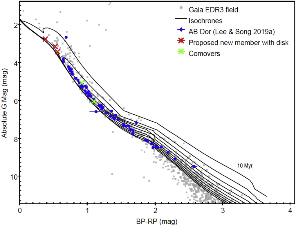 Figure 3 shows a color–magnitude diagram for AB Doradus, including the Gaia EDR3 field main sequence, shown in gray. The solid lines show isochrones at 10, 20, 30,...,100 Myr from Marigo et al. (2017) available online. 16 The blue points show the previously identified members of AB Doradus from Lee & Song (2019a). The red and green x's show our proposed new members: the red objects have infrared excess; the green are co-moving with them.