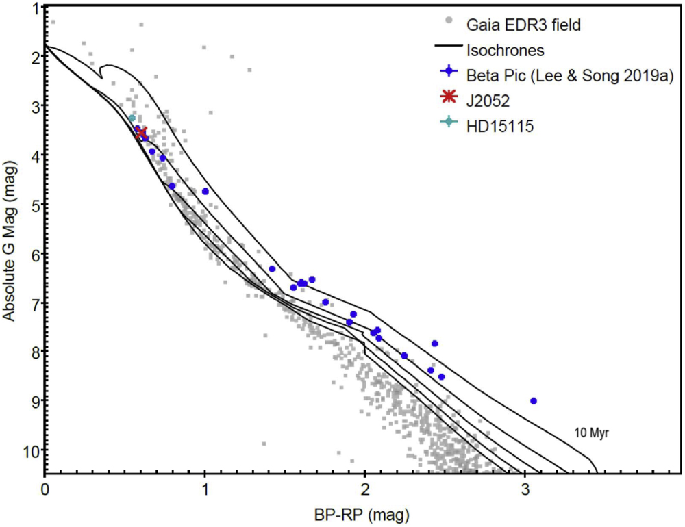 Standard image High-resolution imageThe members from Lee & Song (2019a) are found above the main-sequence EDR3 field, consistent with Mamajek & Bell (2014), Binks & Jeffries (2016, 2014), and Messina et al. (2016) at around 24 Myr and our proposed new member appears to be consistent with the previously identified members of β Pictoris.