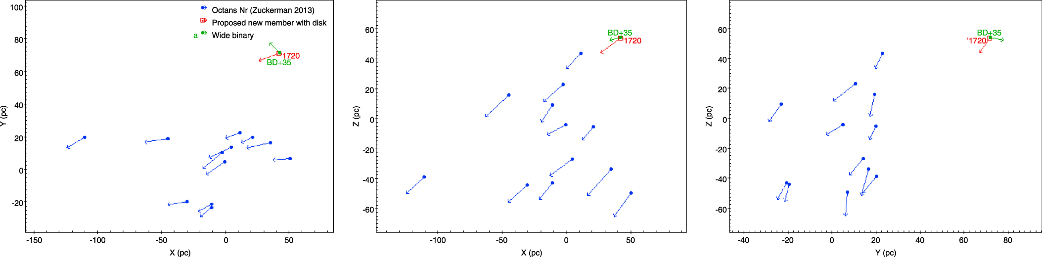 Standard image High-resolution imageWe applied our process to the Zuckerman et al. (2013) star list. We recovered one previously known member listed by Zuckerman et al. (2013): J034239.80-203243.3, which was discovered by Patel et al. (2014) to have an infrared excess. Additionally we identify two other stars that may be related to Octans-Near, which reside somewhat farther from the Sun than the rest of Octans-Near, in the opposite direction from Octans. These, nonetheless, resemble Octans-Near in velocity and show signs of youth (infrared excess and X-ray emission). These stars are roughly 25 pc away from the edge of Octans-Near (in the Y direction); for comparison, Octans-Near spans about 40 pc in this direction.