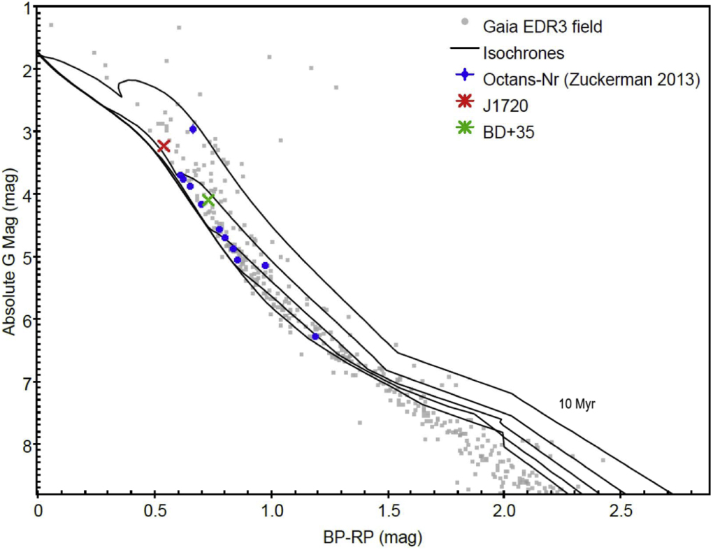 Figure 7. CMD of Octans-Near (blue) previously proposed by Zuckerman et al. (2013), with one proposed new member with disk J1720 (red) and wide binary companion (BD+35 2953) to this star (green) found by Andrews et al. (2017) with isochrones from 10 Myr (top) to 50 Myr (bottom) and Gaia EDR3 field stars.
