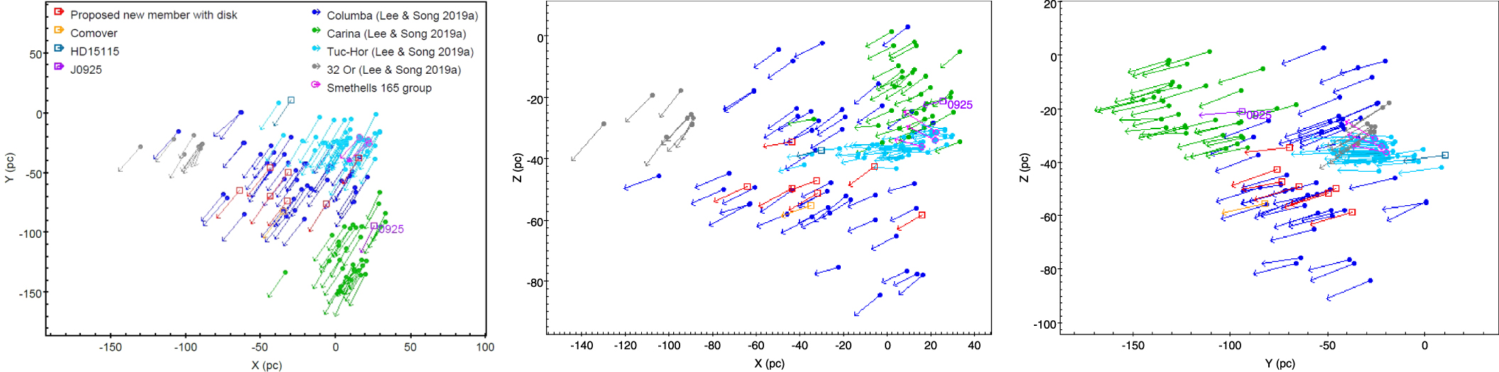 Figure 13. Proposed new disk-hosting kinematic members of Columba–Carina (red), with co-mover (orange), extreme debris disk candidate J0925 (magenta), and previously identified members of Columba (blue) and Carina (green) from Lee & Song (2019a) in XYZ (parsecs from the Sun) with vectors showing UVW (parsecs per 1000 yr).
