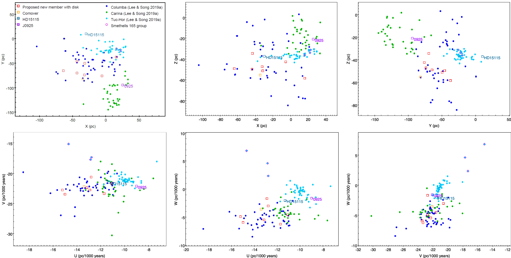 Figure 9. Proposed new members of Carina, Columba, and Tuc-Hor, together with known members according to Lee & Song (2019a) in XYZ (parsecs from the Sun) in the top three frames and UVW (parsecs per 1000 yr) in the bottom three frames. The proposed new members of Columba–Carina and Tuc-Hor are the red squares and the co-mover is the orange square. The extreme debris disk candidate, TYC 9196-2916-1 (J092521.90-673224.8), is the magenta square. HD 15115 is the dark teal square. Columba are the filled blue dots, Carina are the filled green dots, and Tuc-Hor are the filled turquoise dots. The proposed Smethells 165 group members are the magenta rings.