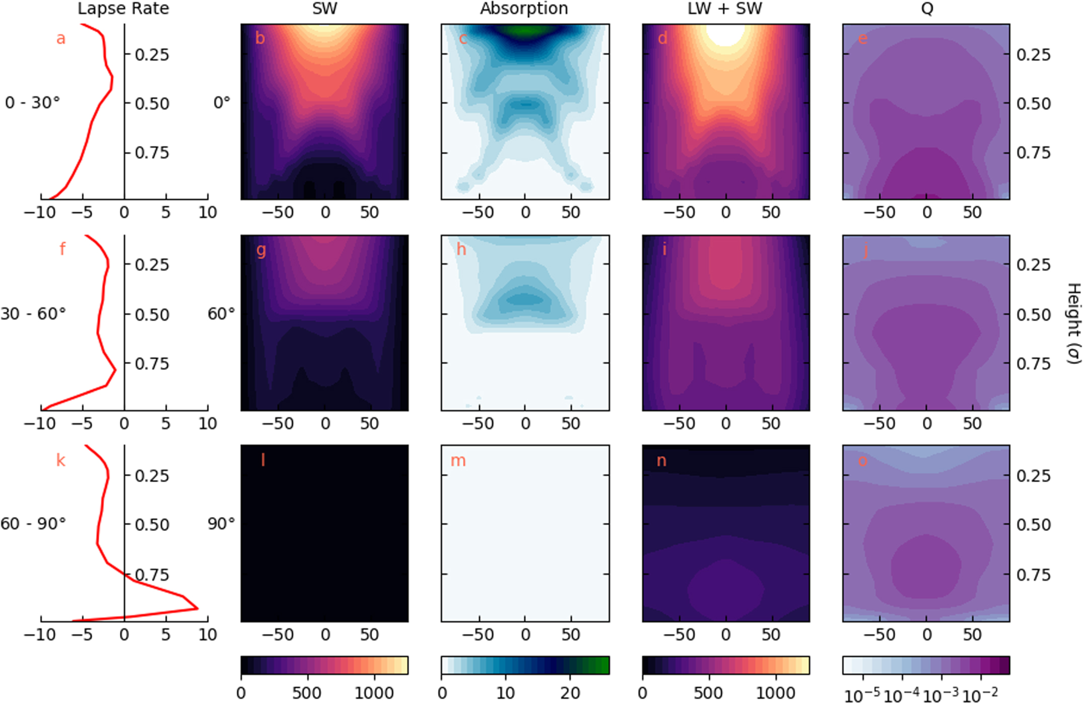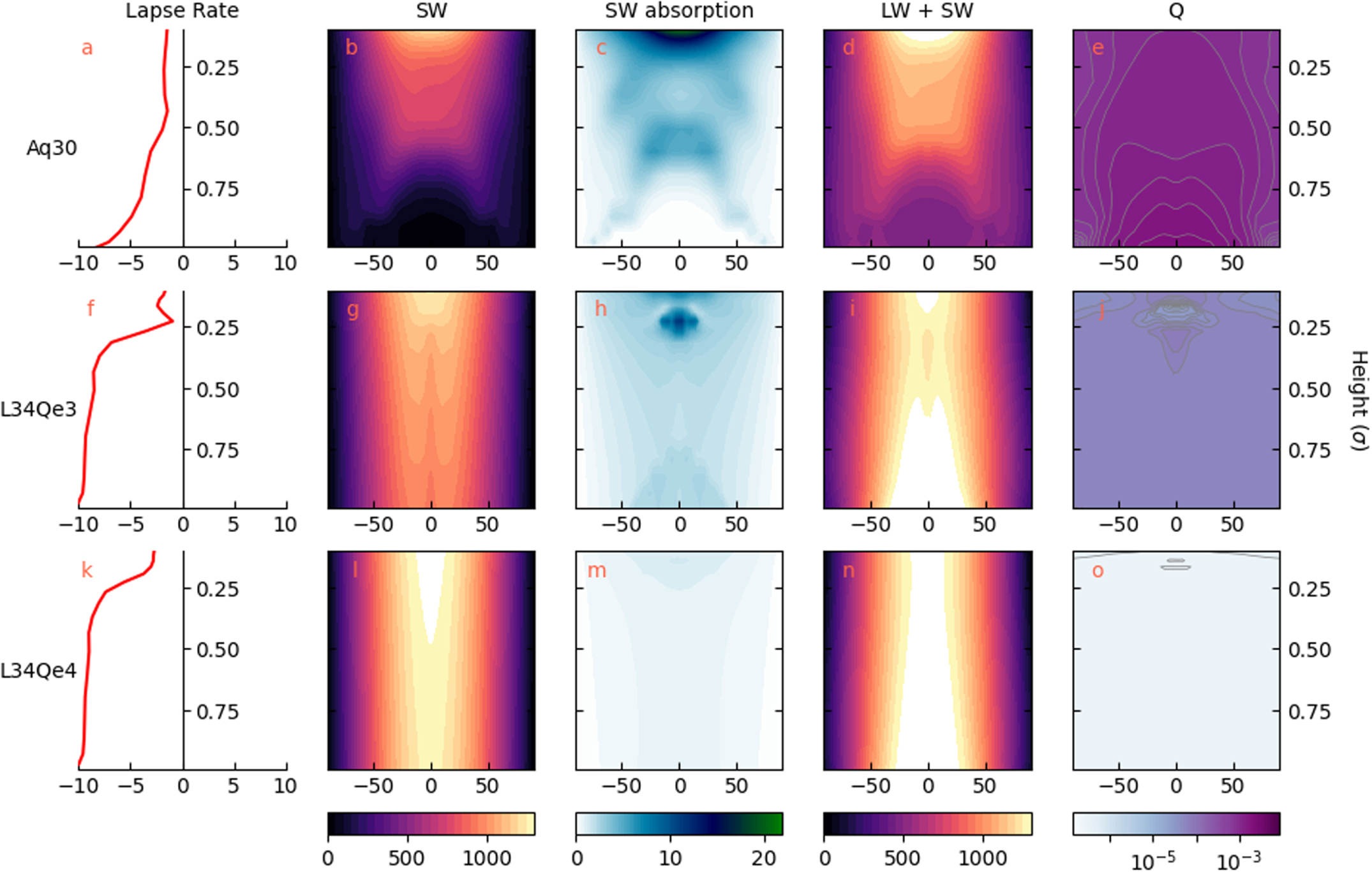 Figure 5. Radiative profiles for Aq34. The left column shows the temperature lapse rate (K km−1), calculated with the area-weighted average of the regions 0°–30° (a), 30°–60° (f), and 60°–90° (k) from the substellar point. The remaining columns, from left to right, show the downward SW (W m2); the solar heating rate (K day−1); the total downward radiation (SW + LW); and the specific humidity (kg kg−1). The cross sections were taken at longitudes 0°, 60°, and 90°.