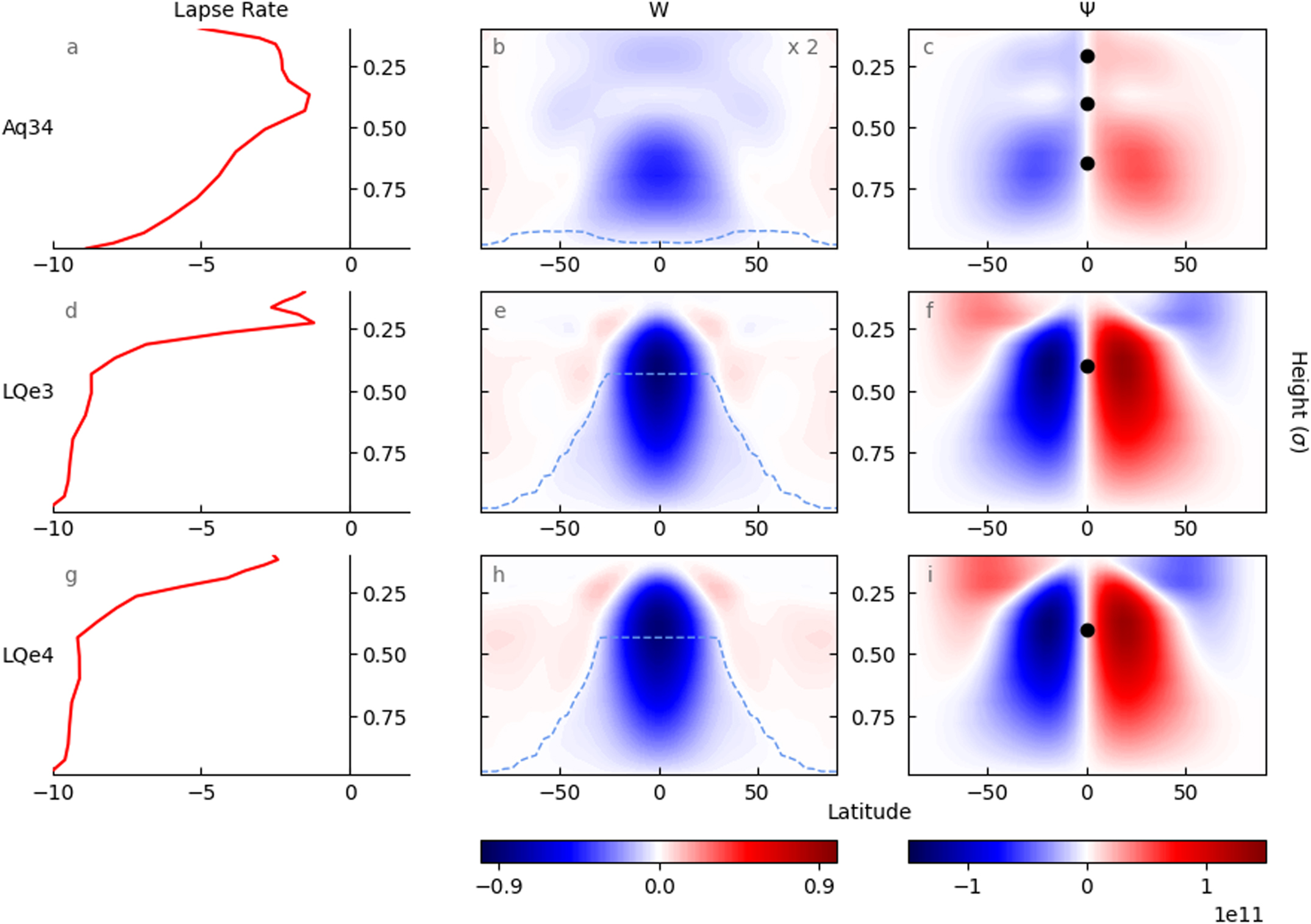 Figure 6. Comparison of aquaplanet (Aq34) and land-planet (L34Qe3 and L34Qe4) simulations with orbital periods of 34 days. The left column shows the atmospheric lapse rate, averaged between 0° and 30° from the substellar point. The middle column shows the vertical velocity (Pa s−1) and the boundary layer depth (the dashed line). The right column shows the mass stream functions (kg s−1), with the black markers indicating the levels where the substellar horizontal flow divergence switches sign. The velocity and stream function cross sections are averaged zonally from −15° to 15° latitude. The vertical velocity values for (b) are multiplied by a factor of 2, to allow for easier comparison.