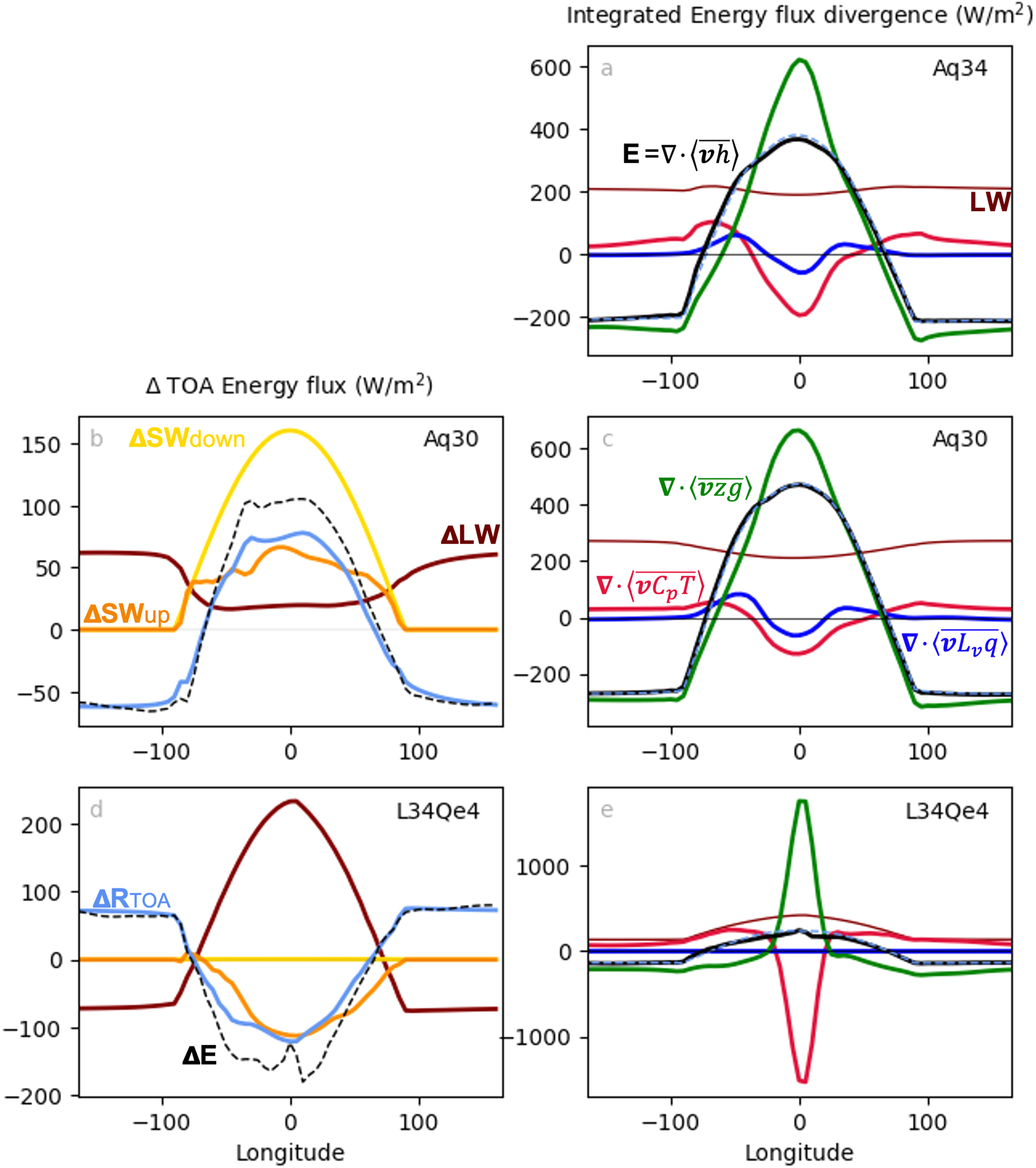 Standard image High-resolution imageAs we increase the stellar flux (Aq30), the increased dayside SW (ΔSWdown) is slightly reduced, due to the reflection from the TOA albedo (ΔSWup), and balanced, partially by the increased LW (ΔLW), but mostly by the increased energy transport divergence (ΔE). This can be noted in Figure 8(b), which compares Aq30 to Aq34. The net energy transport remains similar in shape (Figures 8(a) and (c)), but the net sensible energy transport is slightly reduced, in favor of latent and potential energy transport.