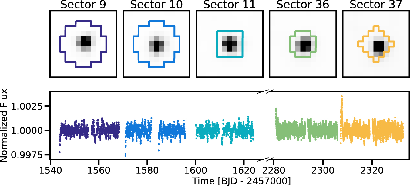 Figure 1. eleanor best-fit apertures (top) overlaid on the TESS target pixel files (TPFs) extracted per each sector. The TPFs are all scaled from 0–30,000 e−1 s−1. We use these apertures to extract the flux within eleanor, which are then corrected via the default eleanor corrected flux routine (bottom). Apertures and light curves are colored by TESS sector.