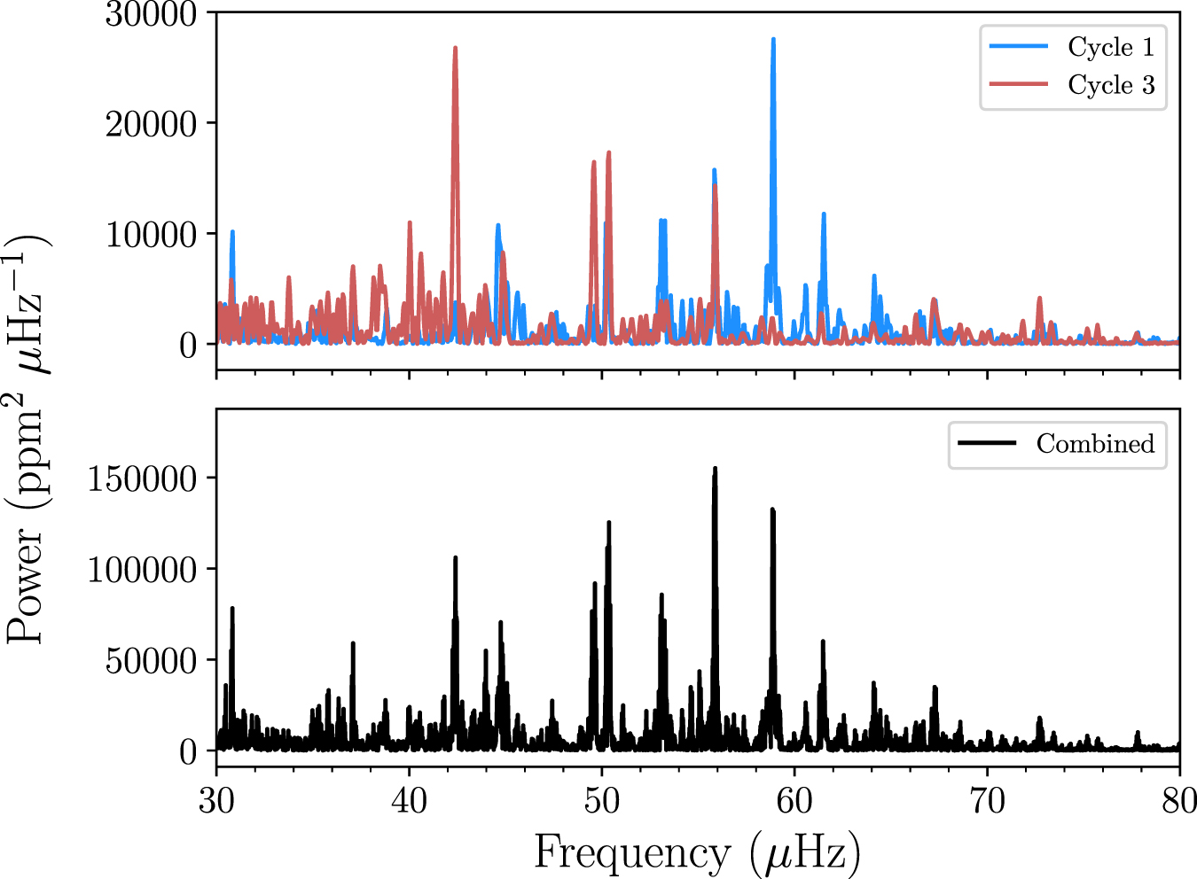 , compared with the Cycle 3 data. Bottom panel: power spectra of the combined light curve that is used for the asteroseismic analysis.