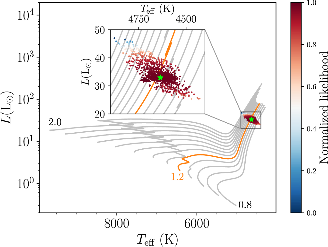 Figure 6. Evolutionary tracks for a series of ASTEC models with different initial masses but the same chemical abundance (X = 0.714 and Z = 0.0142, corresponding to [Fe/H] = −0.09) and mixing length parameter (α = 1.927) that are the optimization outputs of the BESTP pipeline. The initial masses of the models increase from 0.8–2.0 M⊙ with a step of 0.1 M⊙. The evolutionary track indicated by orange is with an initial mass of 1.2 M⊙, which is closest to the adopted value (Table 1). Sampling points by BESTP are drawn in the diagram and also in the inset, with color-coded normalized likelihood values. The green star marks the location of our best-fitting model (M = 1.21 M⊙, X = 0.713, and Z = 0.0145) from BESTP.