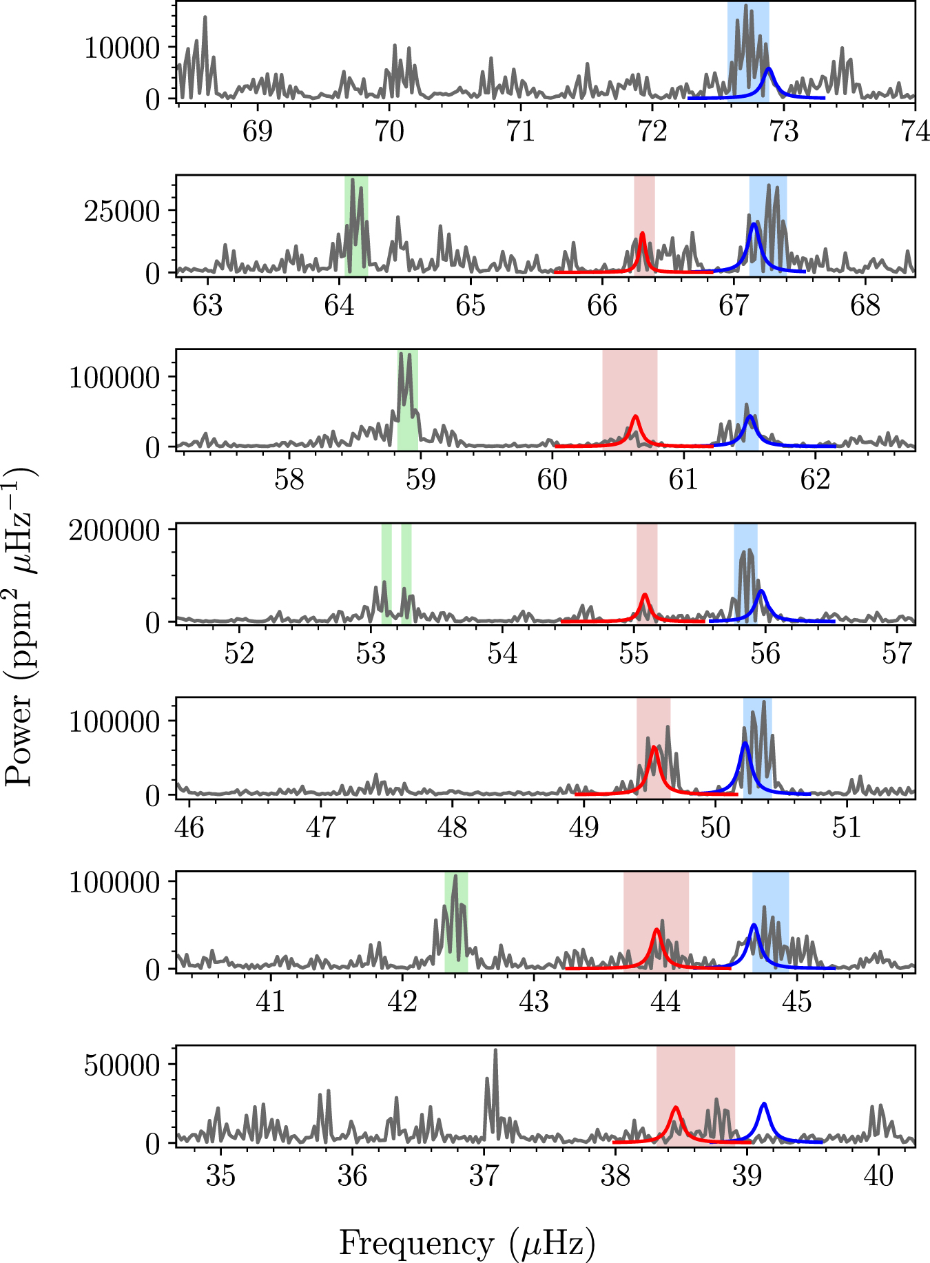 Standard image High-resolution imageFigure 7. Background-corrected PSD (dark gray) plotted in the échelle diagram format, which divides the spectrum into bins each Δν wide. The blue and red peaks are the ℓ = 0 and 2 modes, respectively, of the best-fitting model returned by BESTP (Figure 6). The line width and amplitude of the theoretical modes are derived using the formulae introduced in Lund et al. (2017) and Ball et al. (2018). The corresponding observed frequencies and uncertainties (Table 2) are indicated by the horizontal spans, with additional ℓ = 1 modes in green.