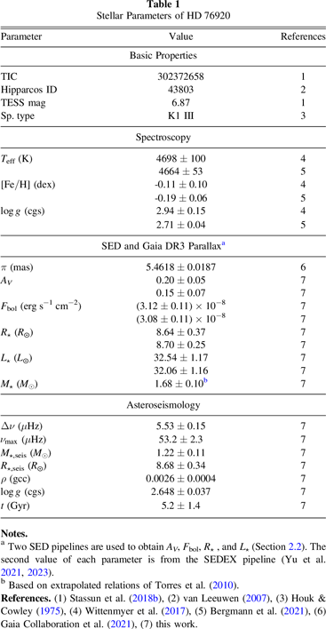 au. There is no evidence of any unseen binary companion, suggesting a scattering event rather than Kozai oscillations as the probable explanation for the observed eccentricity, and making the system valuable to the study of the evolution and occurrence of planets around evolved stars. TESS detected solar-like oscillations in HD 76920 for the first time. Bergmann et al. (2021) analyzed three sectors (9, 10, and 11) of TESS data and estimated the stellar mass and radius through the scaling relations (Brown et al. 1991; Kjeldsen & Bedding 1995; Stello et al. 2008; Kallinger et al. 2010) using the measurements of global seismic parameters. While the scaling relations provide decent estimates of the stellar mass and radius for stars showing solar-like oscillations, improvements, in terms of accuracy and precision, of the estimates can be achieved by using asteroseismic modeling and individual oscillation modes.