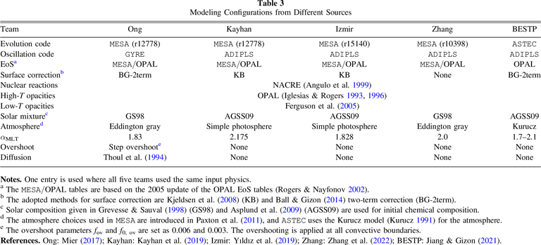 a The MESA/OPAL tables are based on the 2005 update of the OPAL EoS tables (Rogers & Nayfonov 2002). b The adopted methods for surface correction are Kjeldsen et al. (2008) (KB) and Ball & Gizon (2014) two-term correction (BG-2term). c Solar composition given in Grevesse & Sauval (1998) (GS98) and Asplund et al. (2009) (AGSS09) are used for initial chemical composition. d The atmosphere choices used in MESA are introduced in Paxton et al. (2011), and ASTEC uses the Kurucz model (Kurucz 1991) for the atmosphere. e The overshoot parameters fov and f0, ov are set as 0.006 and 0.003. The overshooting is applied at all convective boundaries.References. Ong: Mier (2017); Kayhan: Kayhan et al. (2019); Izmir: Yıldız et al. (2019); Zhang: Zhang et al. (2022); BESTP: Jiang & Gizon (2021).