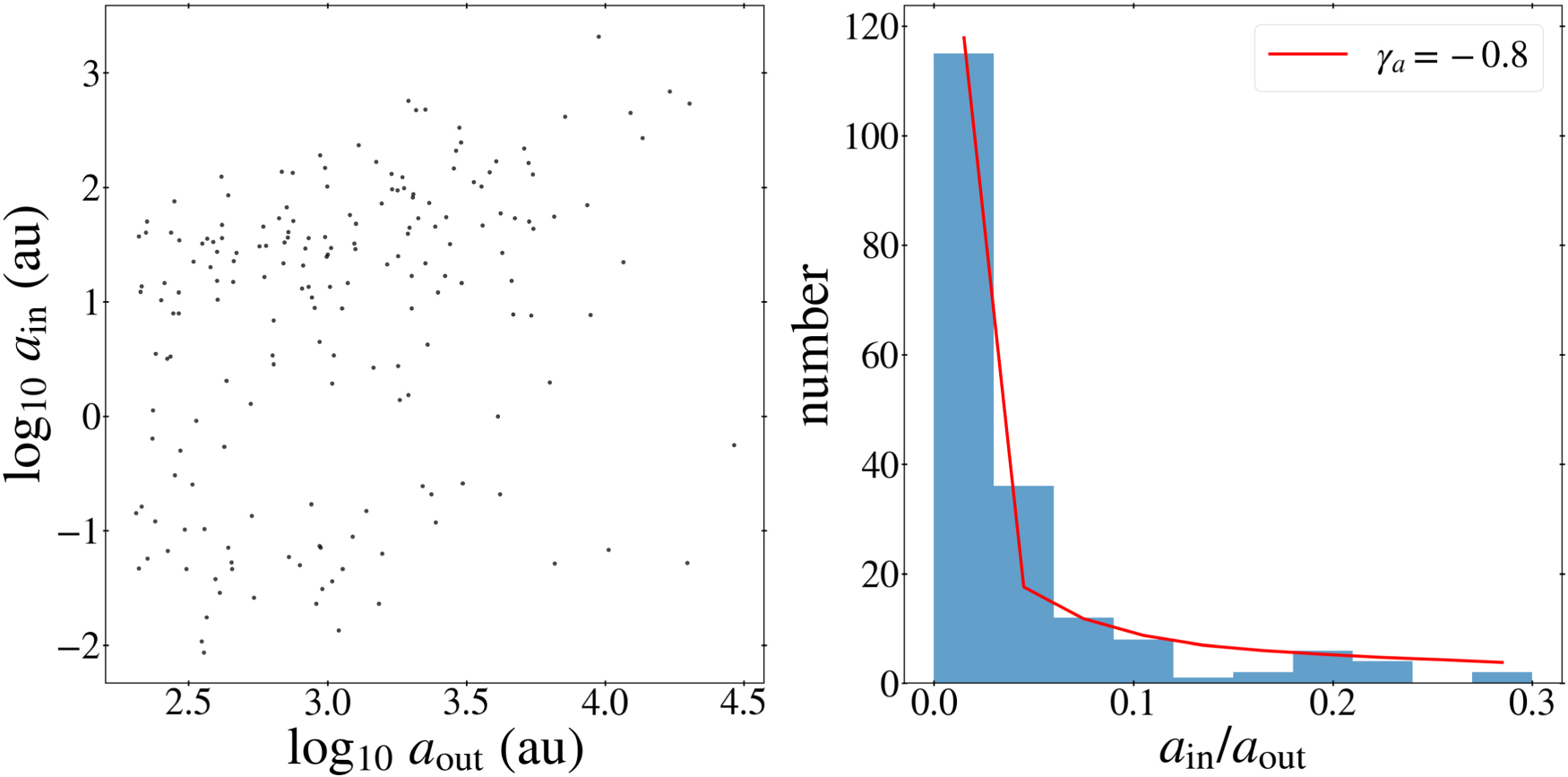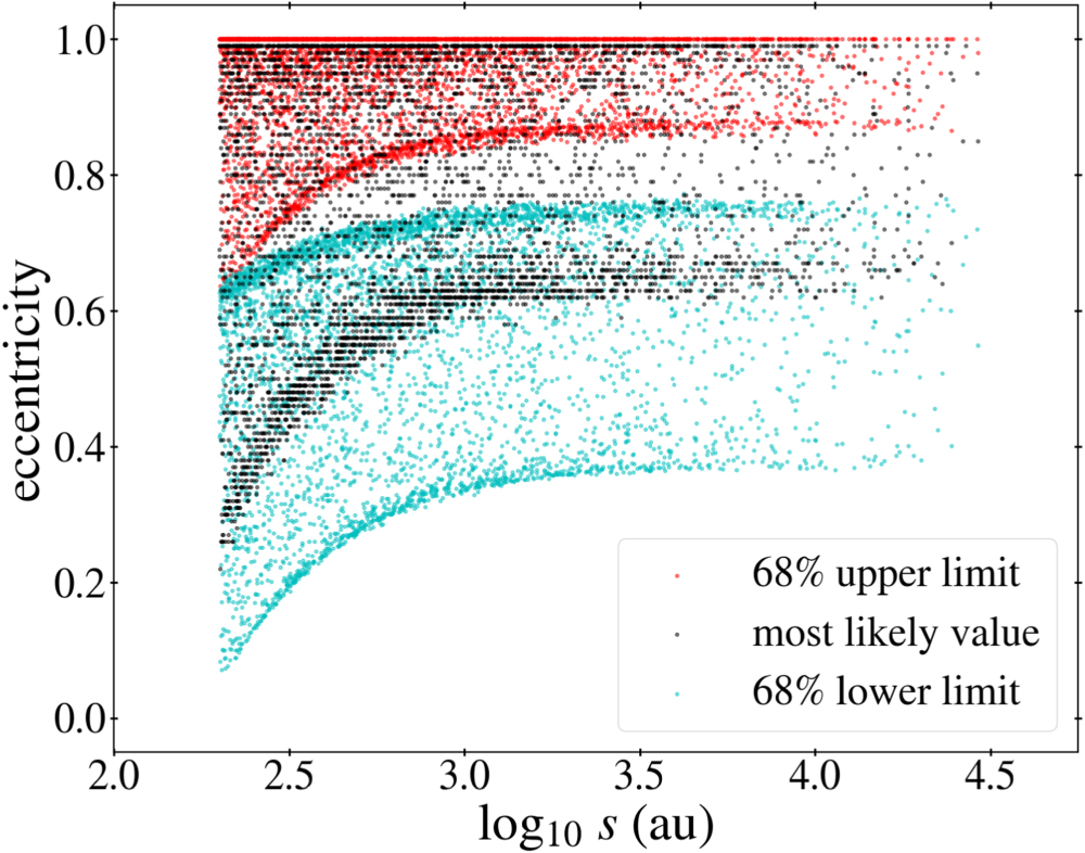 Figure 28. The same as the left panels of Figure 19 and Figure 21 but with 0.01 au < ain < 0.3aout, i.e., including the optional choice in Equation (20).