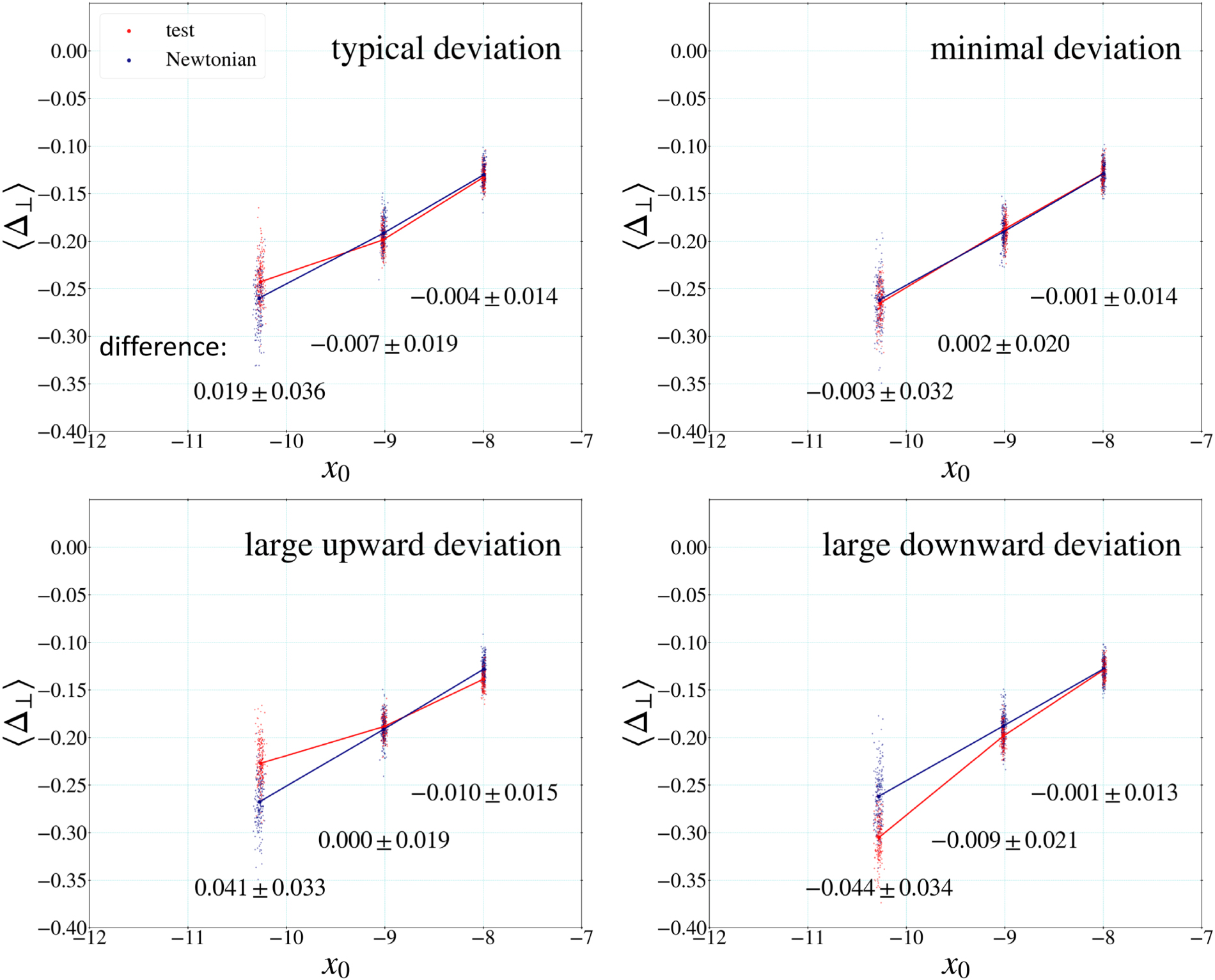 The lowest bin −12 < x0 < −10.5 exhibits a minor upward deviation compared with the −10.5 < x0 < −9.8 bin from the larger dM < 200 pc sample. The deviation seems not so significant statistically. However, this could represent a small difference in the edge effects between the real data and the Newtonian simulated data because, unlike the highest acceleration bin, they have different distributions.