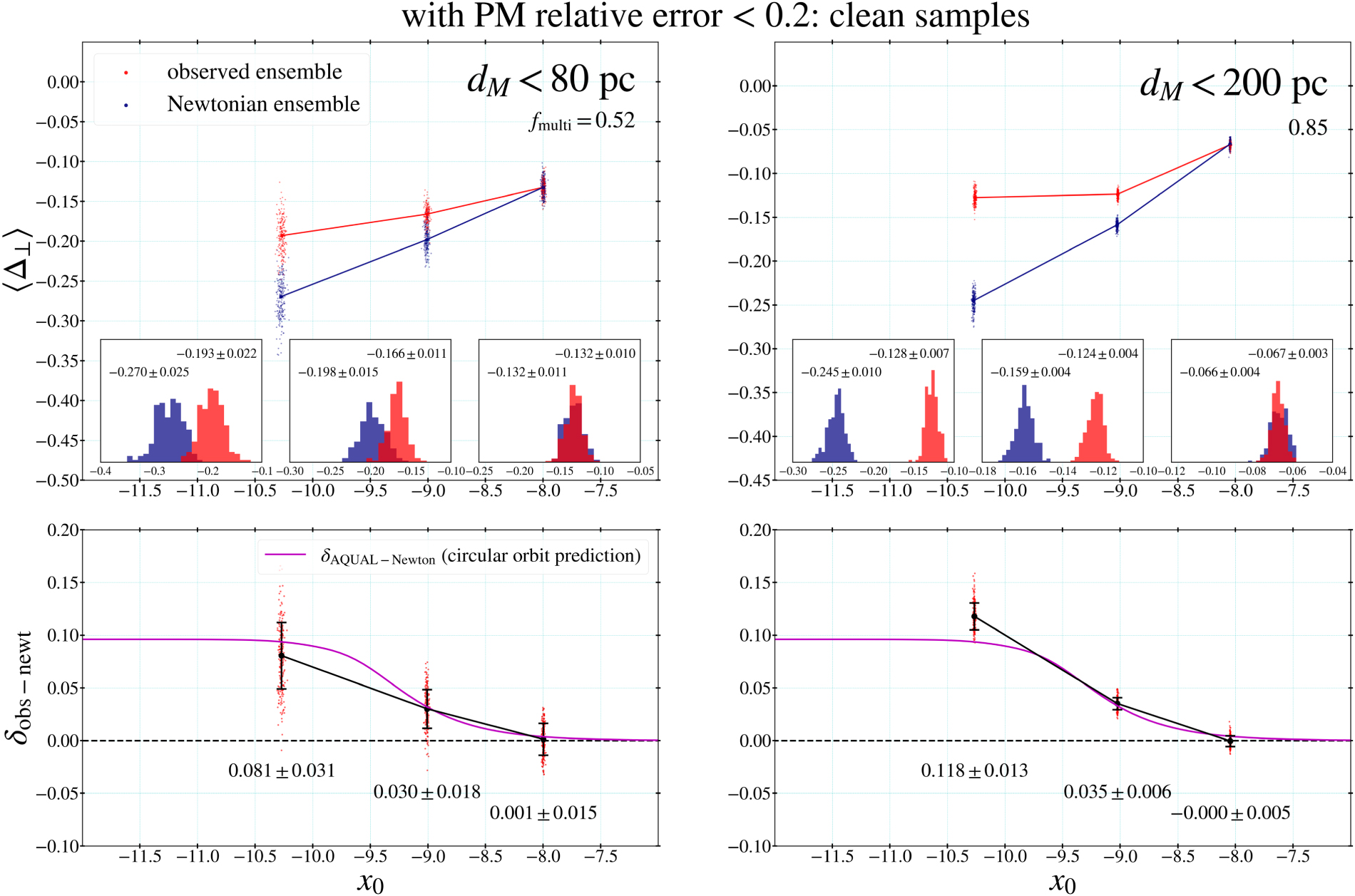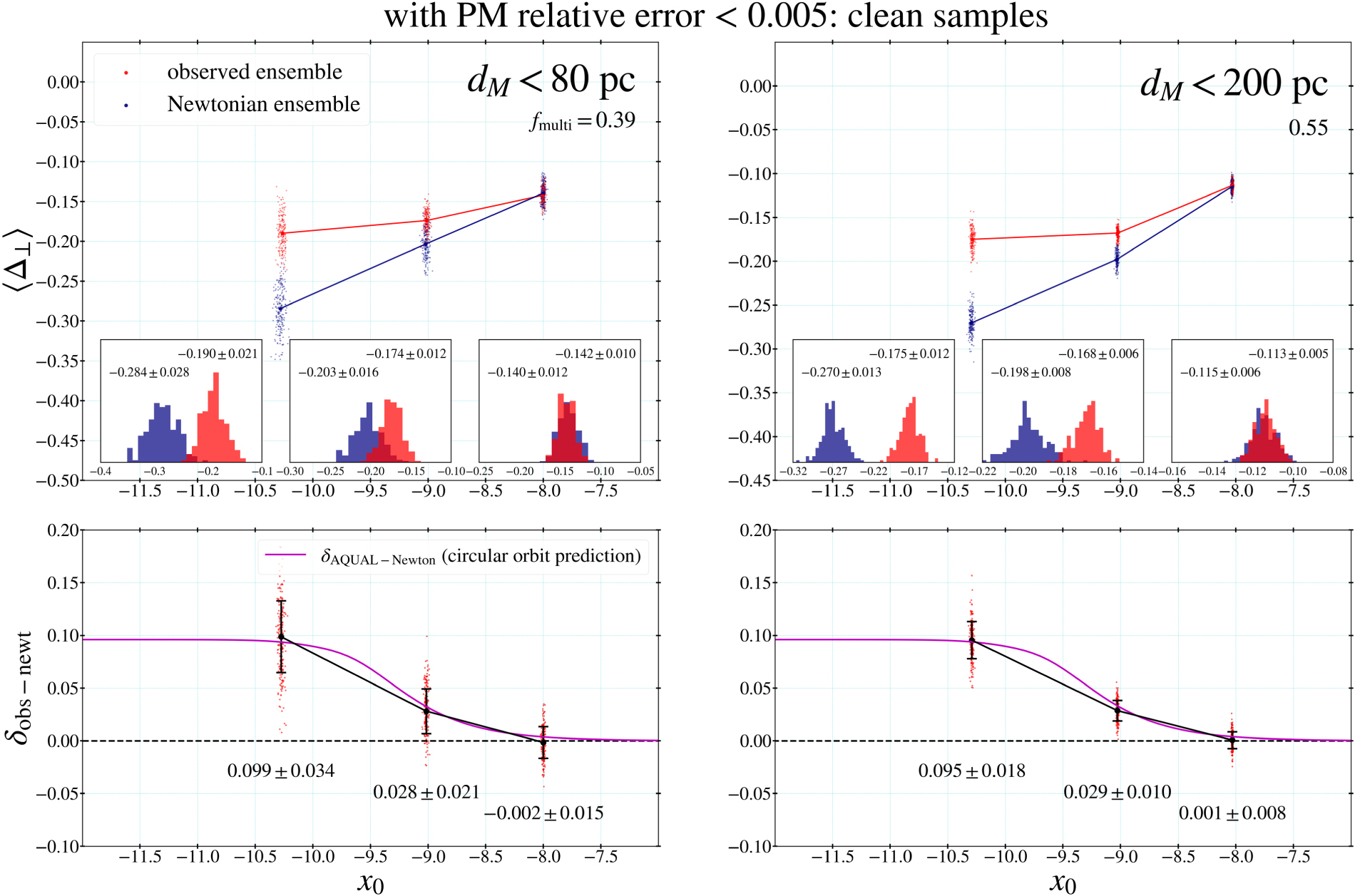 Figure 27. The same as the left panels of Figure 19 and Figure 21 but for subsamples with radial velocities matched within 3σ: the upper and lower results are with PM relative errors <0.01 and <0.005, respectively. The results on δobs−newt are consistent with the main results, while the fitted values of fmulti are lower.