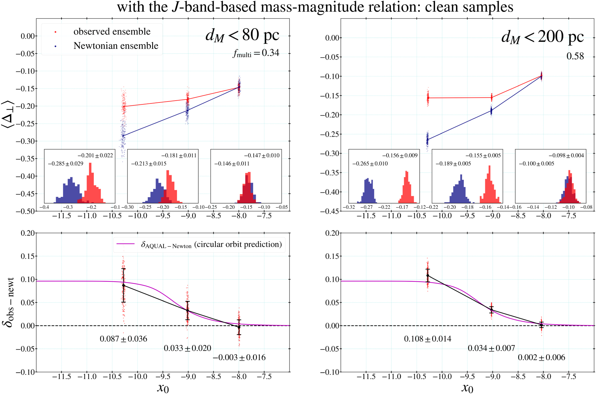 Figure 35. Results with a tighter cut on PM errors are shown. Note that fmulti is decreased by a small amount for the dM < 80 pc sample but by a large amount of 0.20 for the dM < 200 pc sample compared with the samples with the cut <0.01. However, the results on gravitational anomaly δobs−newt are consistent with those for the standard samples.