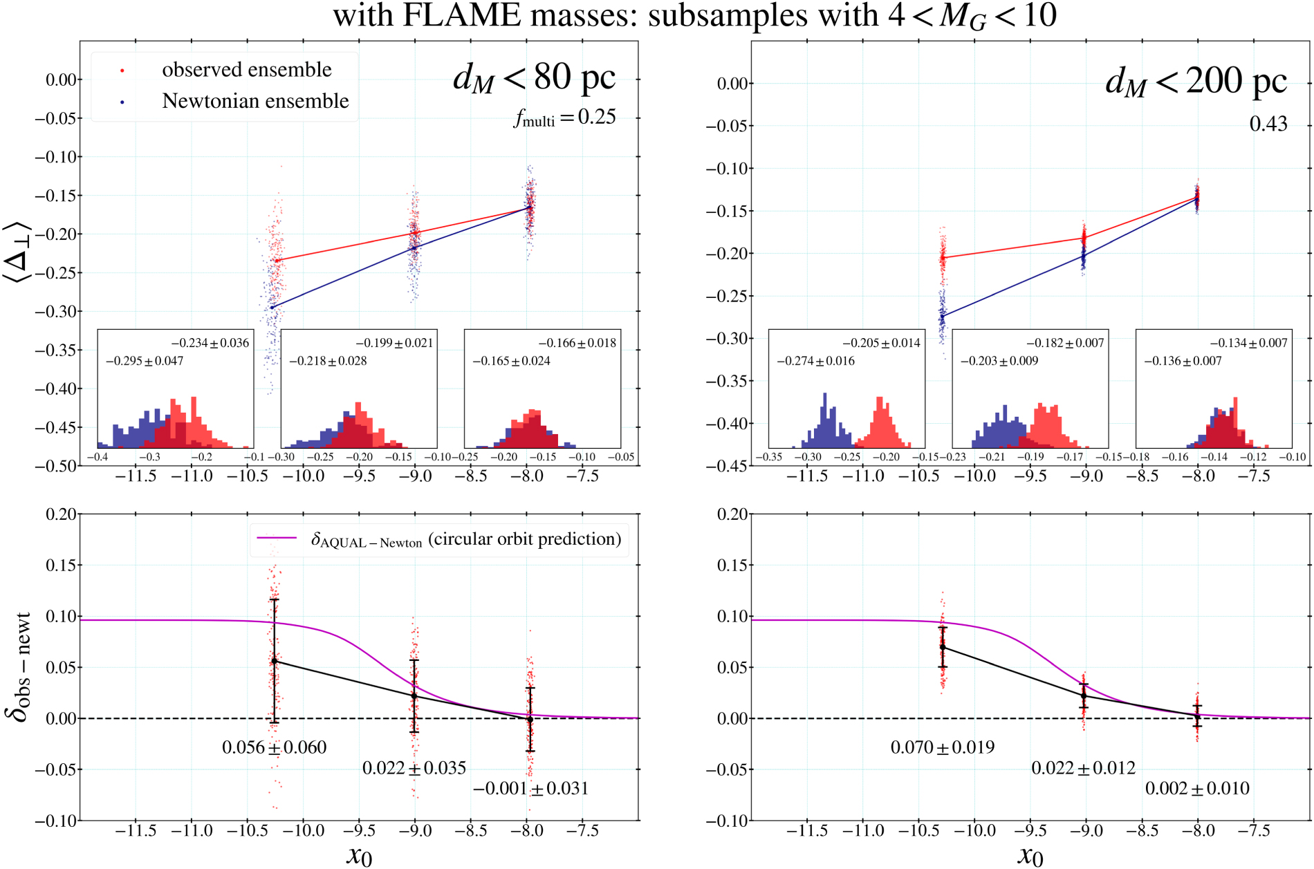 Figure 26. The same as the left panels of Figure 19 and Figure 21 but with the FLAME-masses-based mass–magnitude relation (see Figure 7) for subsamples in the range 4 < MG < 10. The results on δobs−newt are consistent with the standard results, while the fitted values of fmulti are lower. Note that because of a small sample size, the dM < 80 pc result is not statistically significant.