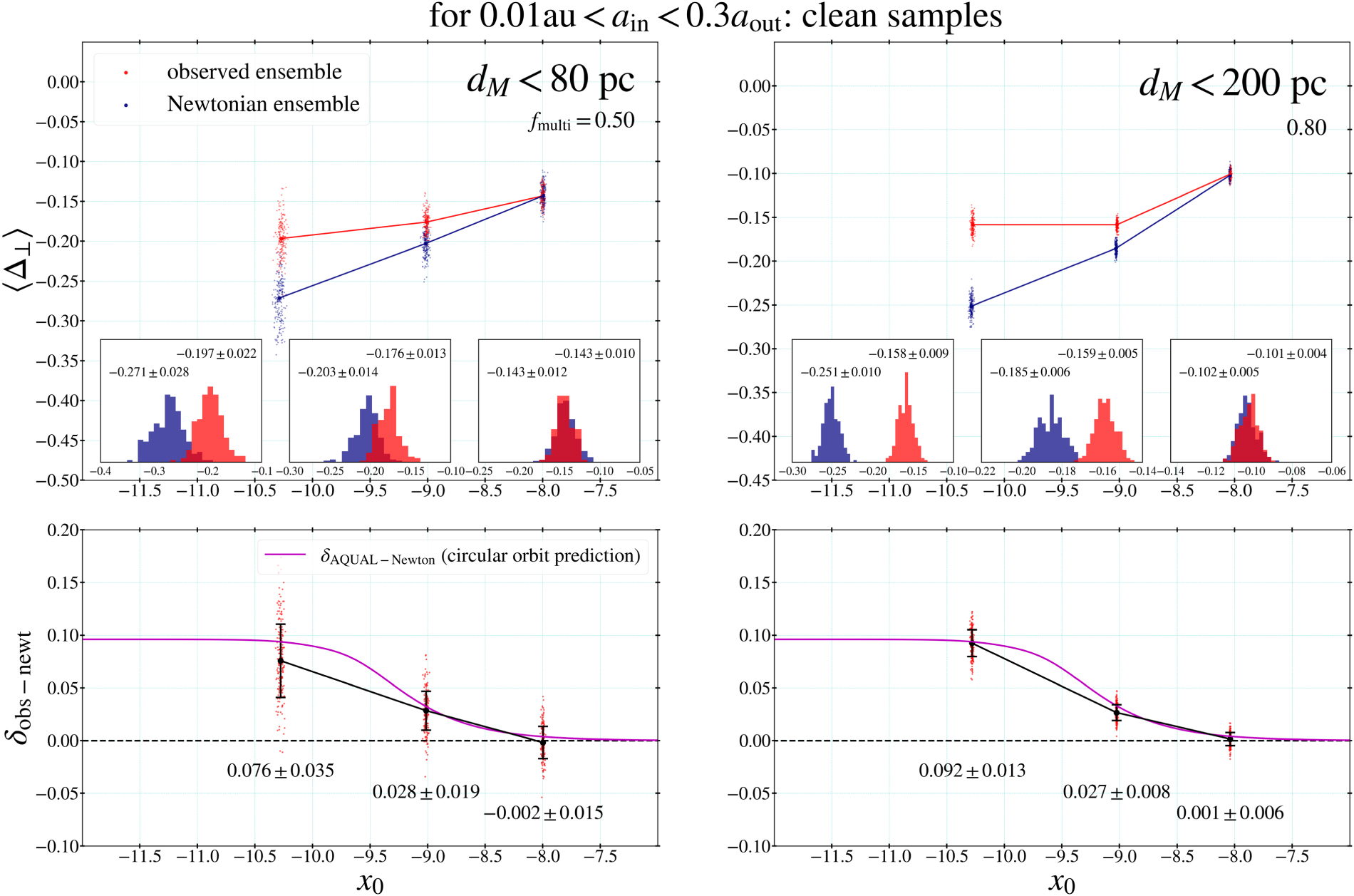 Next we consider changing the upper limit of ain from that of the 1" limit to 0.3aout (the dynamical stability limit) as would be the case if the El-Badry et al. (2021) catalog largely missed inner binary companions. We set ηphot = Mc /(Mh + Mc ) for θin > 1'' as indicated in Equation (20). Figure 28 shows the results for the clean samples. The trend and magnitude of δobs−newt agree well with those with the standard input. However, the fitted values of fmulti are higher because companions are distributed over a larger range of ain.